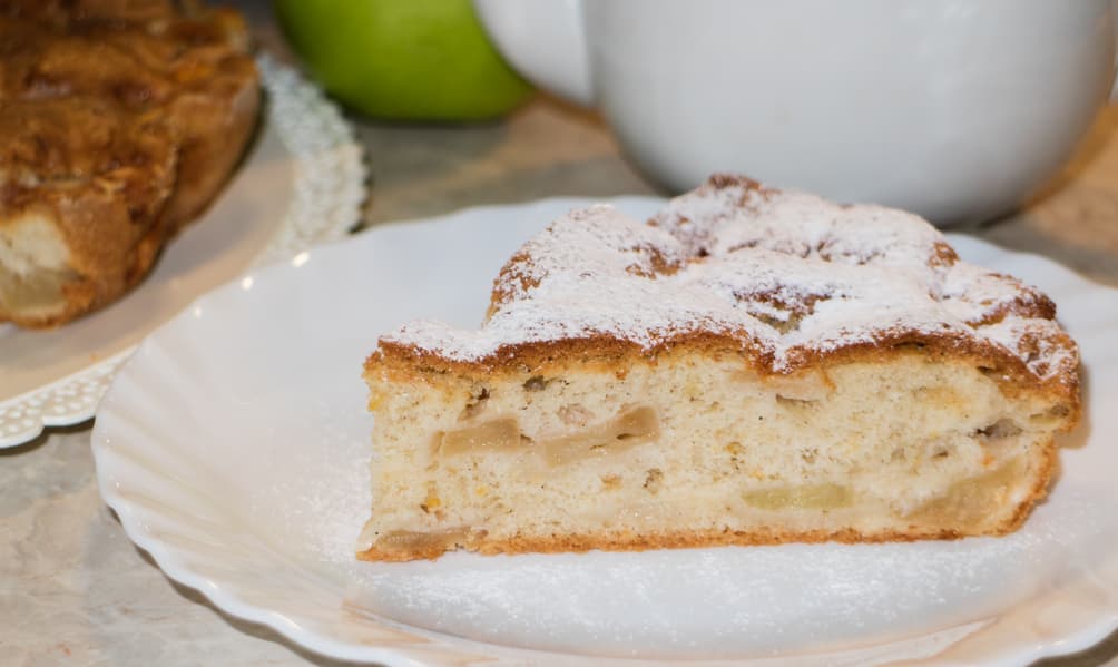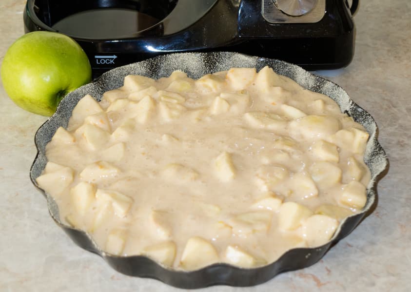 Подготовленные яблоки выложили в форму, смазанную маслом и посыпанную манкой, посыпали кардамоном и залили тестом.