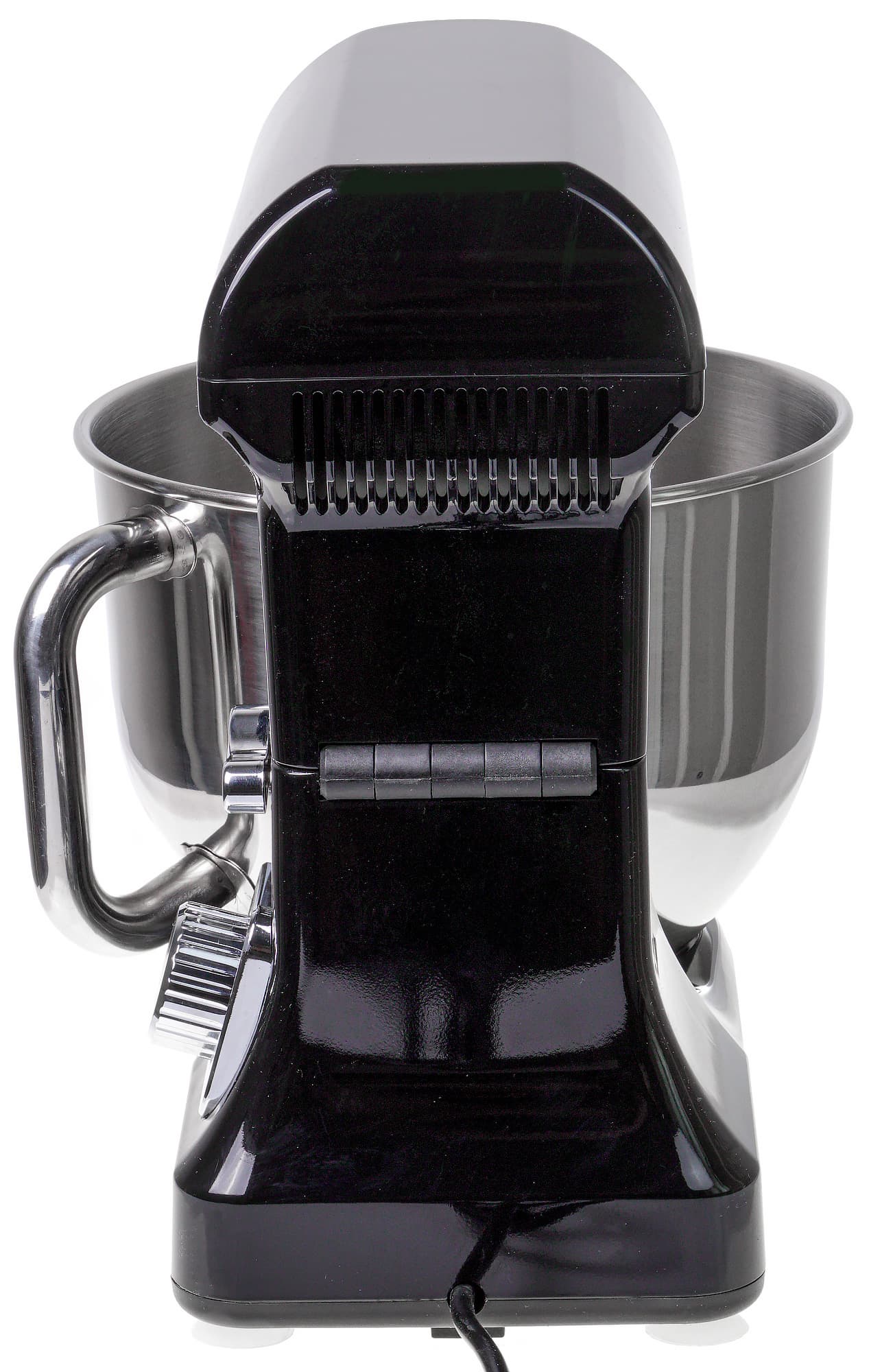 Габариты планетарного миксера Gemlux GL-SM5.2 невелики, что мы оцениваем крайне положительно. Особенно с учетом вместимости его дежи. Конструкция стандартна: основание, в котором фиксируется чаша, откидная головка с местом для установки насадок и корпус с рычагом подъема головки и регулятором скоростей. Изготовлен моторный отсек из пластика черного цвета с серебристой вставкой. Элементы управления также выделены серебристым цветом.