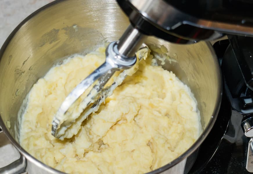 Зафиксировали на валу насадку битер и включили прибор на первую скорость. Насадка вращалась медленно, что идеально при приготовлении картофельного пюре. Когда картофель размялся, мы увеличили скорость до второй, добавили одно яйцо и медленно влили полтора стакана горячего молока. Всего пюре готовилось 2 минуты 20 секунд.