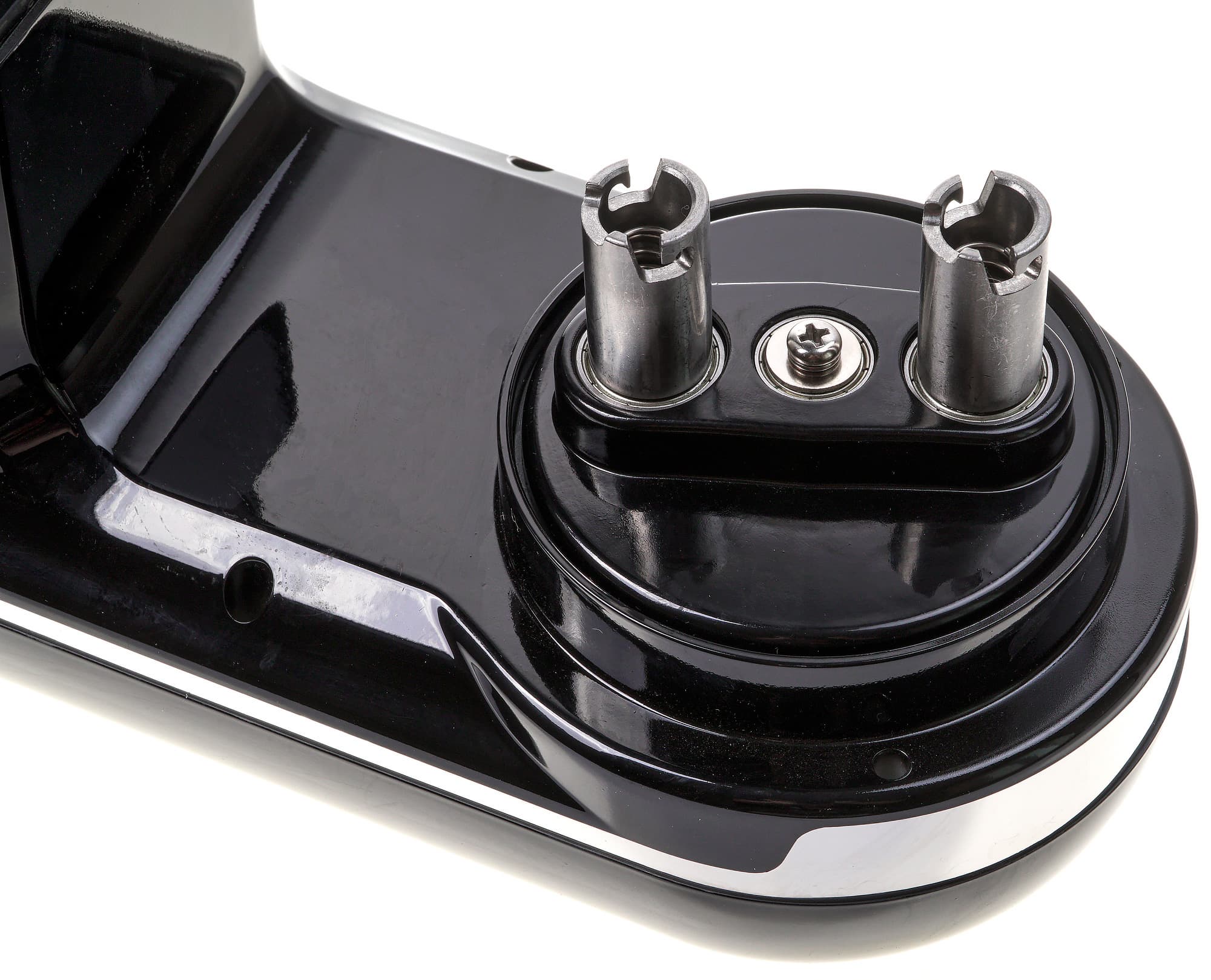 Место с внутренней стороны подвижной головки, в котором фиксируются насадки, выглядит необычно из-за двух приводных валов. Валы стальные, в полости видна пружина для фиксации насадок. Насадки устанавливаются интуитивно понятным образом: нужно совместить поперечный штифт насадки с пазами на валу, вставить аксессуар до упора и повернуть против часовой стрелки.