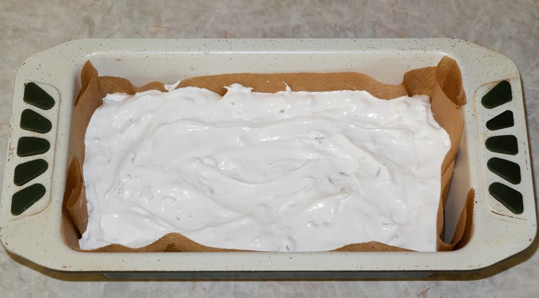 Тщательно вмешали в массу очищенные и крупно нарезанные фисташки (вес неочищенных орехов был около 350 граммов). Затем выложили в две формы, одну простелили пергаментом, другую — фольгой. По итогам можем рекомендовать использовать пергамент, а не фольгу.