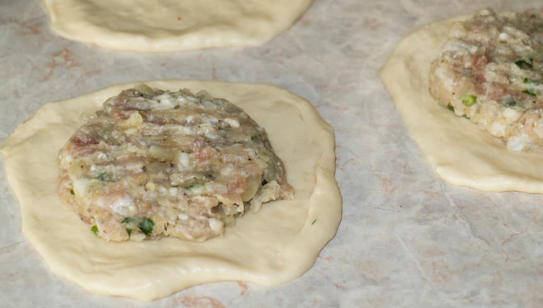 Итого за семь минут мы замесили 900 граммов плотного дрожжевого теста. Оставили его в покое минут на 45. За это время приготовили фарш из свинины, говядины, лука и белокочанной капусты. Затем обмяли тесто, разделили его на равные кусочки и приступили к изготовлению пянсе.