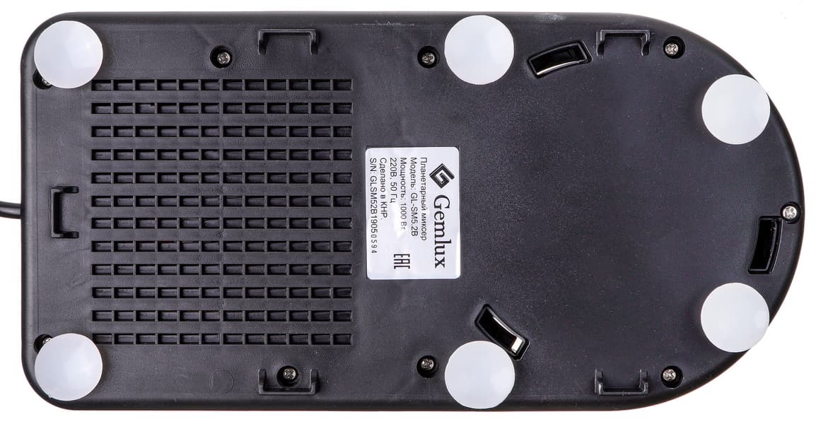 Со стороны дна мы видим шесть ножек, оснащенных внушительными присосками диаметром 2,8 см, вентиляционные отверстия и наклейку-шильдик с технической информацией о приборе. Присоски настолько хорошо выполняют свои функции, что перемещение миксера с места на место даже представляет некоторые сложности.