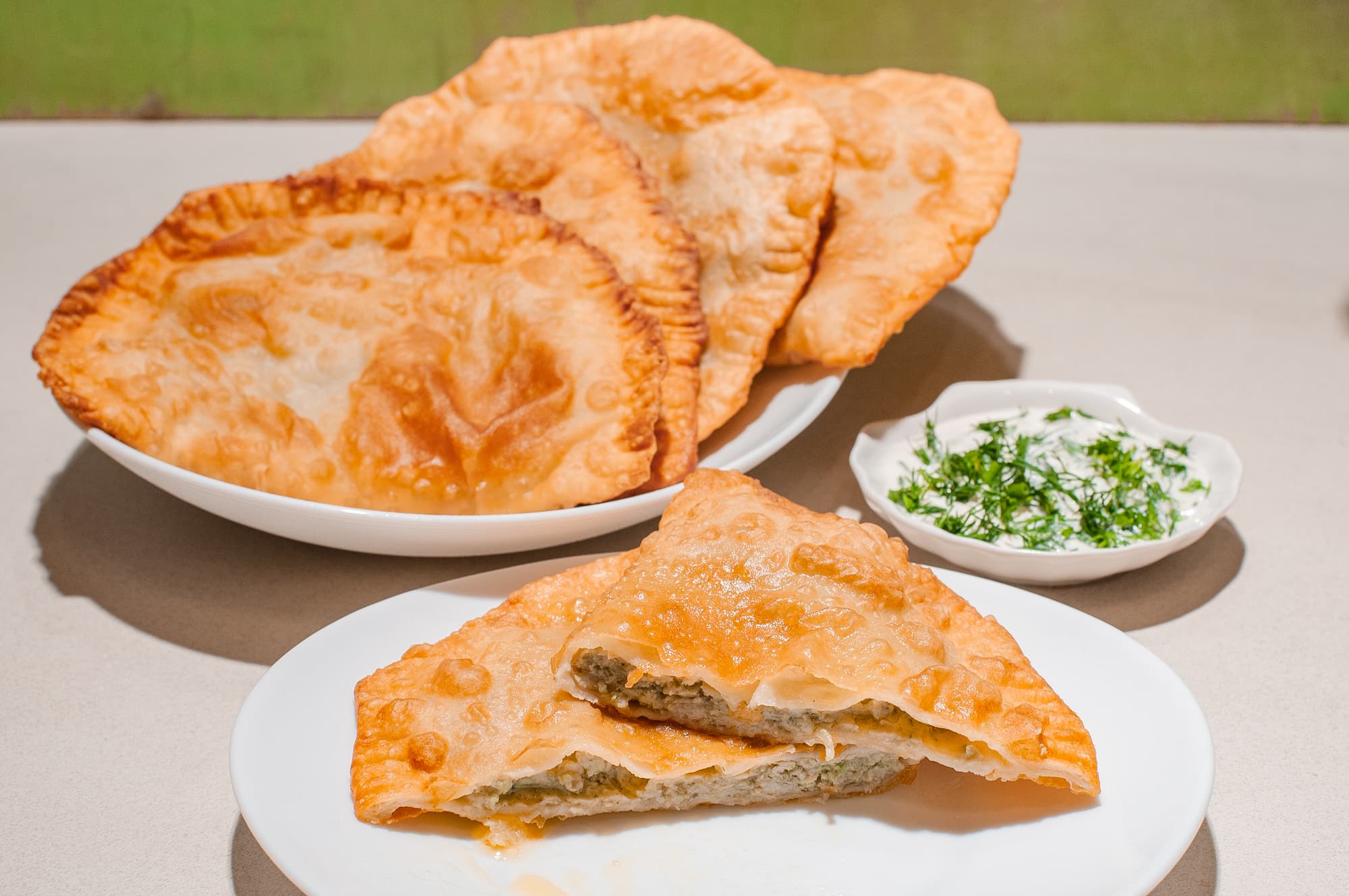 Чебуреки мы готовили с двумя начинками: фаршем из курицы с луком, болгарским перцем с творожным и овечьим сыром и укропом. Тесто состояло из муки, воды, яйца, масла, соли и сахара.