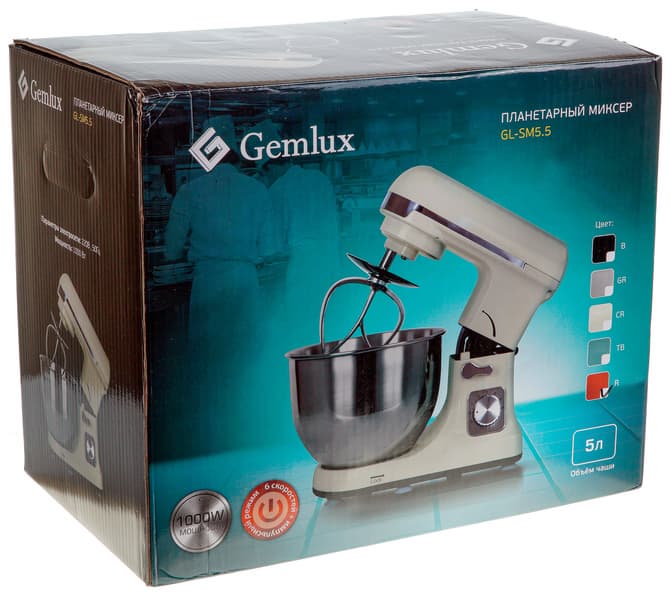 Gemlux GL-SM5.5 — небольшой, удобный в эксплуатации планетарный миксер для домашнего использования. Он значительно сокращает время приготовления некоторых блюд, так как может работать автономно, справляется с тугим тестом (5:3), неплохо взбивает белки и сливки. Вибрации при работе небольшие, а вот уровень шума высокий для аналогичных устройств. Внутреннее устройство, наличие плавного запуска и невысокое потребление при заявленной мощности позволяют надеяться, что прибор прослужит очень долго, если не нарушать правила эксплуатации. Насадки удобно надеваются и меняются в процессе работы, чаша из нержавеющей стали надежно крепится к базе.