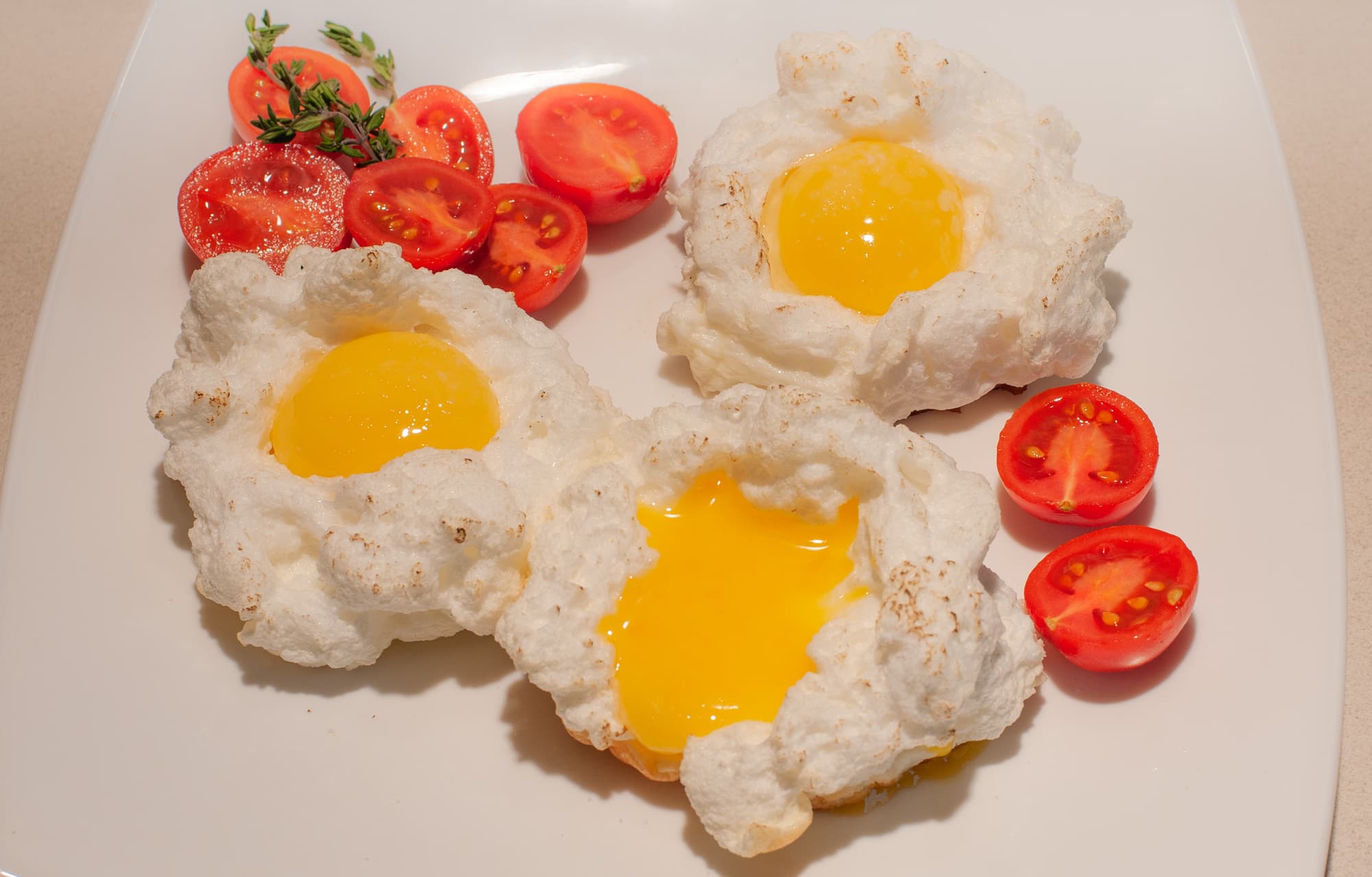 Переложили белки в виде гнезд на небольшие кружочки подготовленных тостов и отправили на несколько минут запекаться. Вынули, в центр добавили по желтку и небольшому кусочку масла, подержали еще пару минут в духовке, выложили на блюдо.