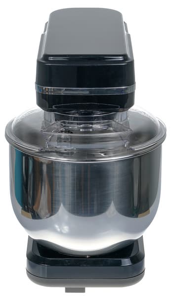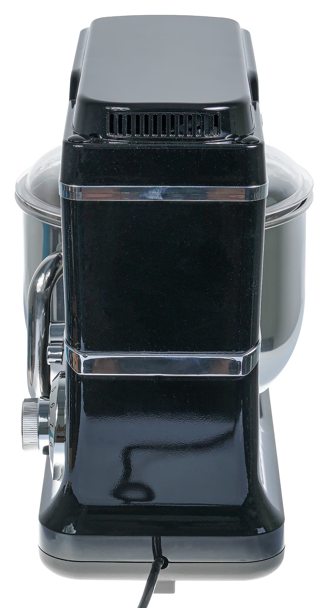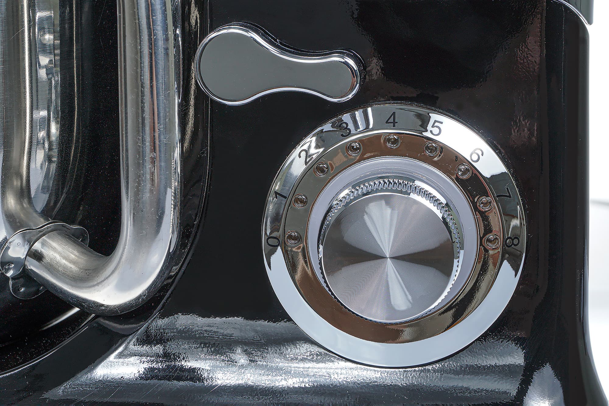 Компактным планетарный миксер Gemlux GL-SM6.8 не назвать, но и ожидать другого от прибора, который укомплектован шестилитровой чашей, по меньшей мере, странно. Прибор оформлен строго, сочетание черного цвета и металлика, прямоугольные формы со скругленными углами, массивное основание оставляют ощущение устойчивости и прочности. Регулятор скоростей и ручка блокиратора откидной головки находятся в привычном месте: в правой нижней части корпуса.