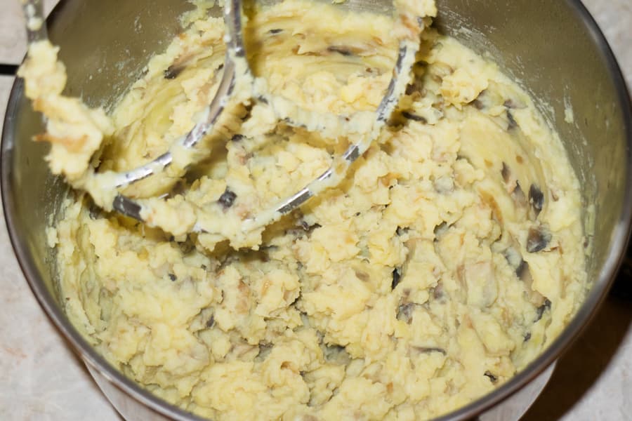 Начали работать на первой скорости. К вращению насадки нет никаких претензий — за минуту мы получили прекрасно измельченный картофель, не превратившийся в клейстер. Добавили яйцо, соль, немного отвара — помешали еще секунд 30. Затем всыпали жареный лук и грибы. Приготовление пюре заняло ровно 2 минуты.