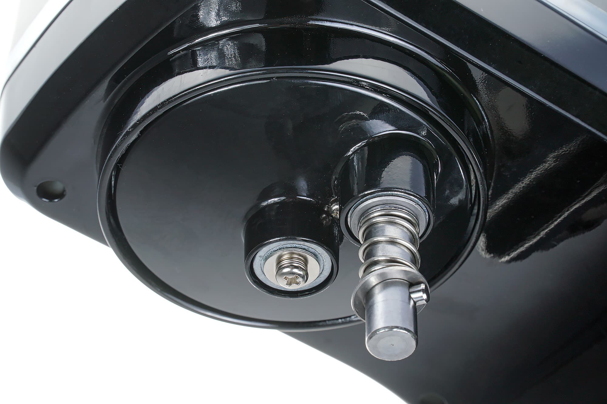 При нажатии на рычаг разблокировки откидная часть миксера плавно поднимается вверх. Процесс происходит без резкого движения и отбрасывания, так что придерживать откидную головку, конечно, нужно, но больше для того, чтобы помочь ей подняться до конца, а не для того, чтобы удержать прибор на месте. С нижней стороны откидной части находится металлический вал для фиксации насадок. Вал имеет поперечный штифт и пружину. Насадки надеваются на шпиндель интуитивно понятным образом: нужно совместить паз на насадке с поперечным штифтом на валу, вставить аксессуар до упора и повернуть по часовой стрелке.