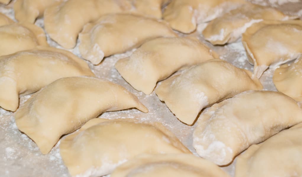 Обернули тесто пленкой и убрали в сторону. За время паузы остыло картофельное пюре с грибами. Налепили вареники.