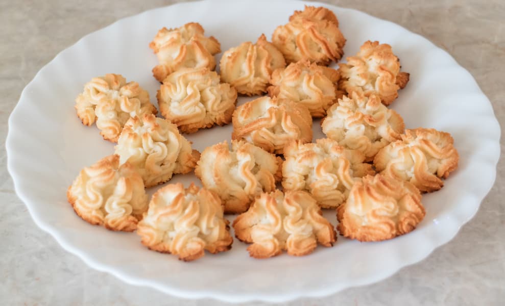 Всыпали ложку с горкой кокосовой муки, перемешали примерно в течение 10-15 секунд. Полученное тесто выложили в кондитерский мешок и отсадили на противень, простеленный пергаментом. Пекли около 15-20 минут на 170 °C. После чего выключили духовку и оставили в ней печенье до полного остывания.