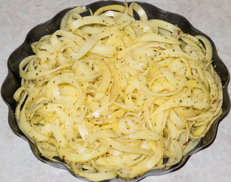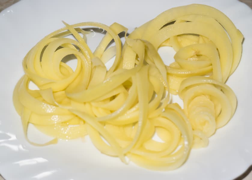 Это, пожалуй, самое известное (в узких кругах) блюдо, для приготовления которого просто необходим спирализатор. С помощью какого иного устройства можно настолько легко и за считанные секунды получить длинные спирали, мы просто не знаем. Кабачок среднего размера был очищен. Для измельчения использовали насадку для средней нарезки.
