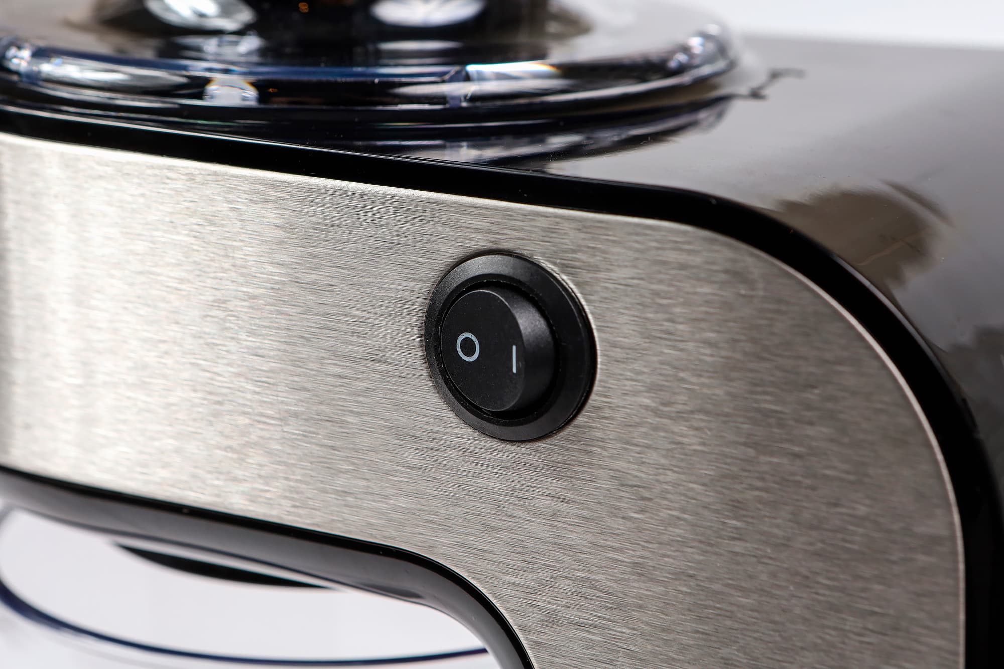 Спиралерезка Gemlux GL-SR-1003 выглядит весьма приятно благодаря использованию простого черного цвета, накладок из нержавеющей стали, скругленных углов и общей простоты форм. Вверху справа на моторном блоке находится кнопка включения/выключения.