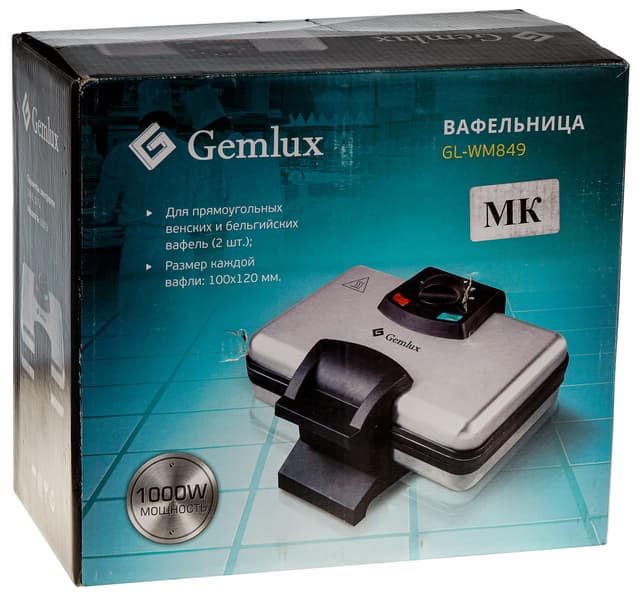 Коробка, в которой вафельница прибыла на тесты, оформлена в фирменном стиле Gemlux. Градуированный бирюзовый цвет с фоновыми фотографиями работающих поваров, наименование изделия, его изображение и основные характеристики. Коробка весьма информативна и не режет глаз. Приспособлением для переноски не оснащена, но ее размеры столь малы, что никаких проблем с транспортировкой прибора не возникнет.
