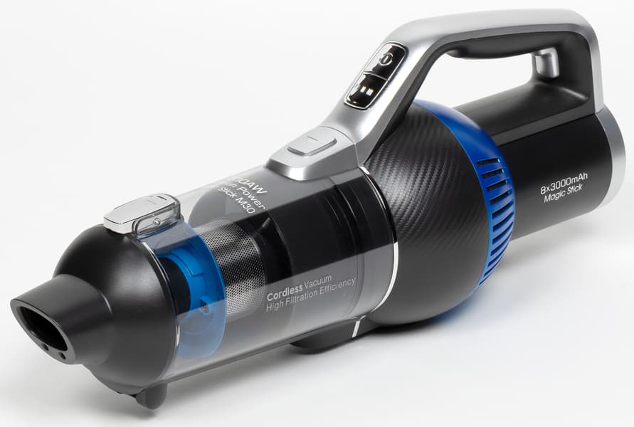 У пылесоса на ручке есть две кнопки: первая включает устройство, вторая последовательно переключает режимы мощности (их у Magic Stick M30 три).