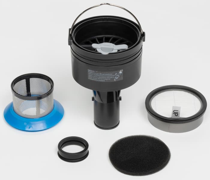 В привычно устроенном циклонном фильтре моторного блока поток воздуха с пылью и мусором попадает в емкость через отверстие в переднем торце корпуса и закручивается внутри цилиндрического контейнера. Крупный мусор задерживается на дне мусоросборника, а средние частицы фильтрует металлическая сетка.
