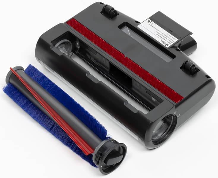 Щетина у моторной щетки средней длины. Валик можно снять для чистки с помощью защелки желтого цвета на правой части насадки. По бокам от вращающегося элемента и в задней части располагаются уплотнительные полоски, которые улучшают прилегание к полу. Основной вес при уборке приходится на два пластиковых колеса.
