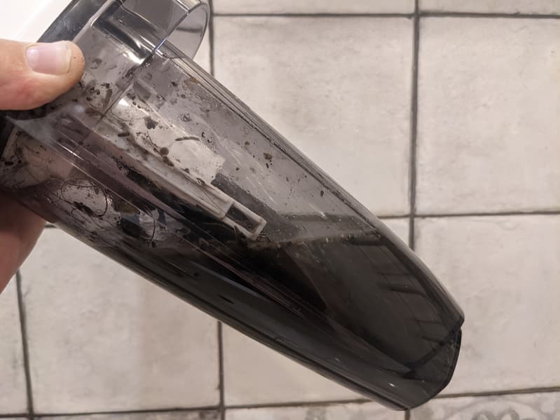 Крупный мусор может собираться в виде внушительной «бороды» на верхнем срезе вертикальной трубки внутри мусоросборника — при сообщении о засорении воздушного тракта в первую очередь стоит смотреть на этот узел. Для очистки можно воспользоваться специальным ершиком, входящим в комплект устройства.