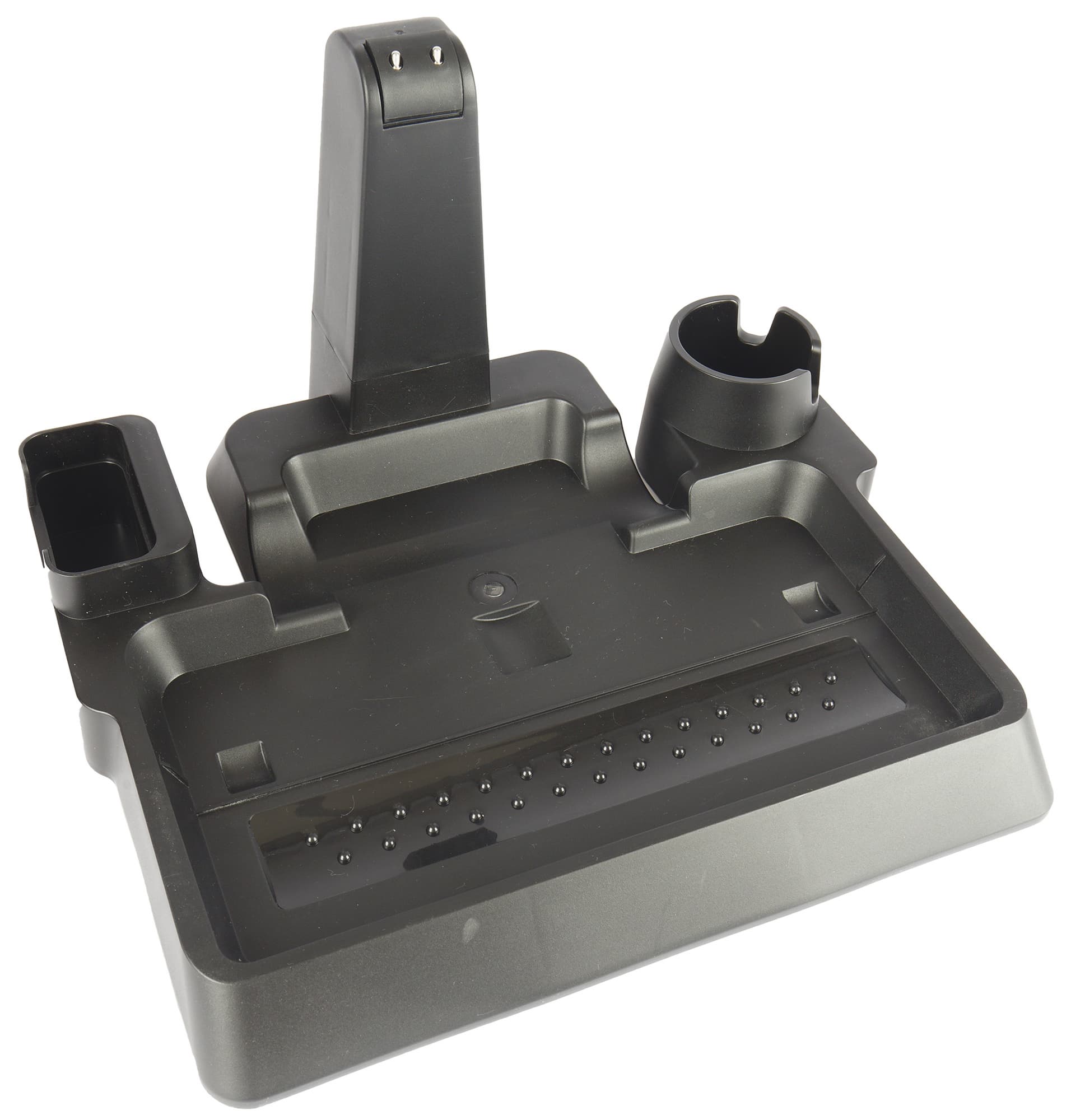 База предназначена для зарядки (за это отвечают два электроконтакта в верхней части) и самоочистки устройства: в ней есть ванночка, в которой собирается вода. На подставке имеются также гнезда для аксессуаров: прямоугольное предназначено для стаканчика-дозатора (мы видели такой у рассмотренного нами чуть ранее Redkey W12), а круглое — для сменного ротора. Но ни того, ни другого в комплекте у нашего экземпляра не оказалось.