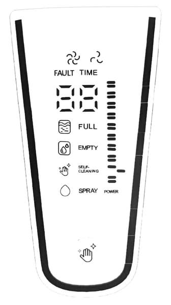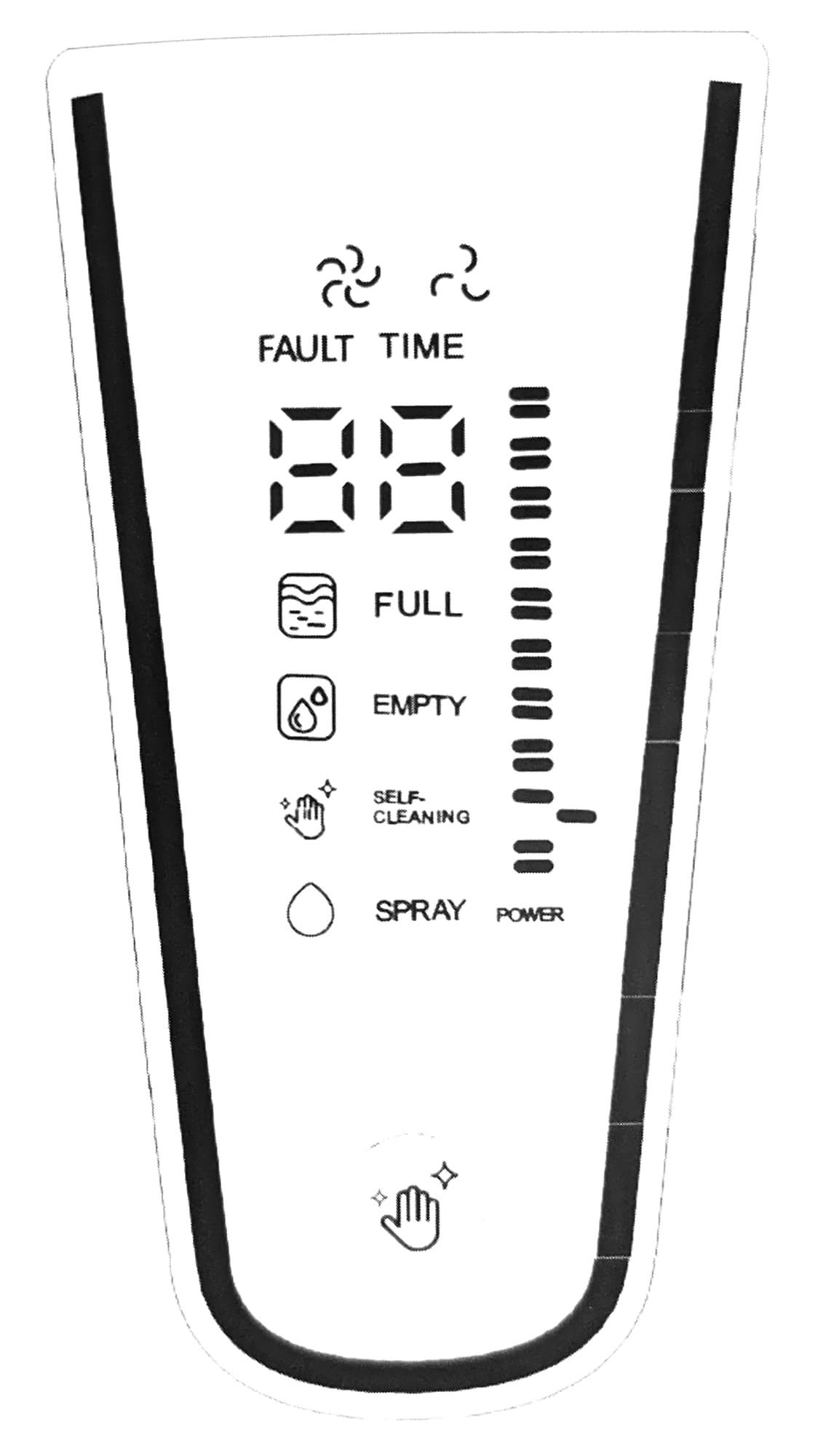 Символы в верхней части обозначают выбранный уровень мощности. На дисплее есть также индикаторы опустошения емкости для чистой воды, переполнения резервуара для грязной жидкости, режима самоочистки (загорается белым при запуске программы) и ручного распыления воды (загорается белым при нажатии соответствующей кнопки).