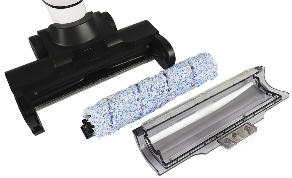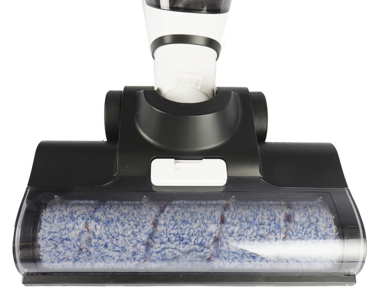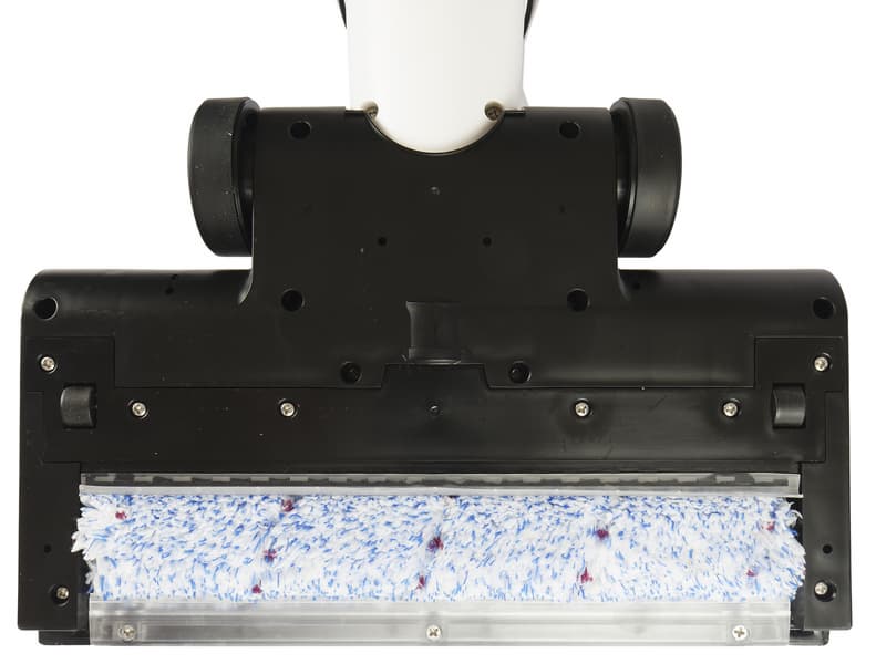 Кожух, закрывающий цилиндрическую щетку из мягкого впитывающего материала, удерживается с помощью защелки на верхней стороне насадки. Он выполнен из такого же прозрачного серого пластика, что и резервуары, — вращение ротора легко контролировать. Турбо-щетка извлекается через верх, поэтому обслуживание пылесоса удобно проводить в парковочном положении — к примеру, на базе для зарядки.