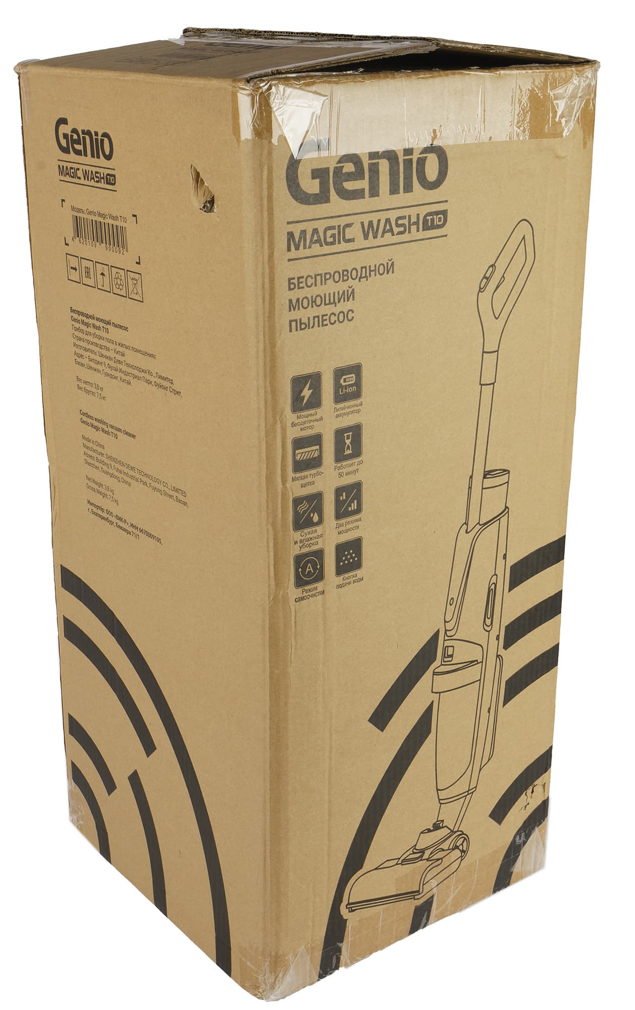 Genio Magic Wash T10 поставляется в подчеркнуто экономичной упаковке: коричневый картон, одноцветная печать и минимум графической информации. На лицевой и задней стороне коробки есть только векторное изображение пылесоса, а под логотипом — иконки, иллюстрирующие основные особенности модели.