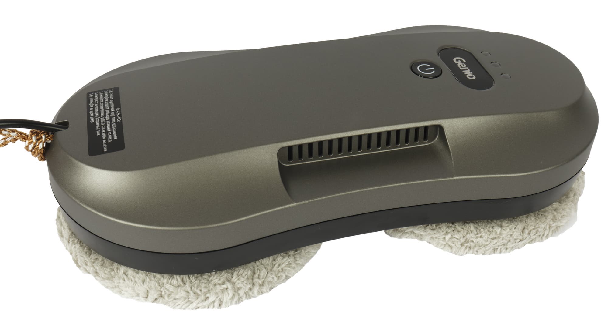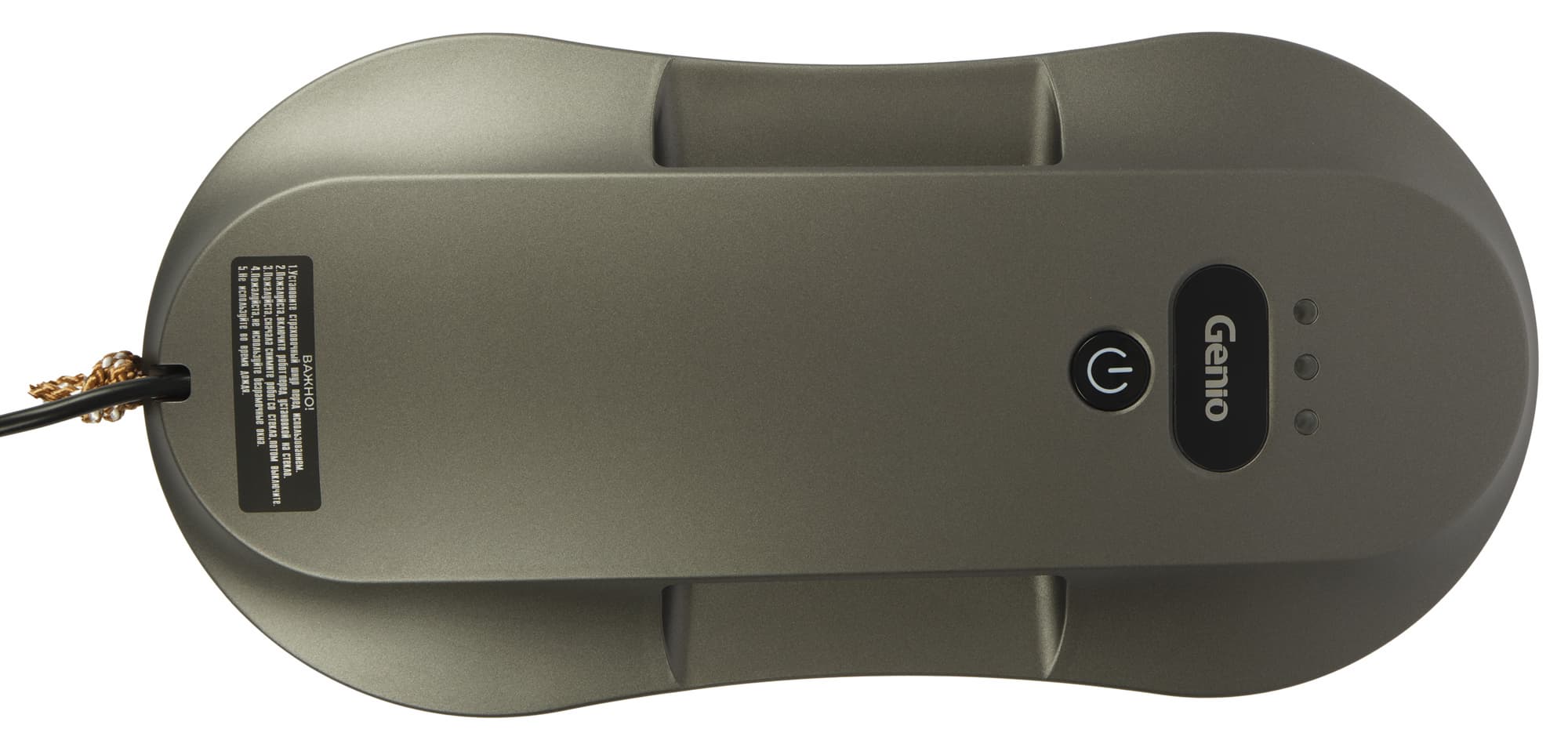 Небольшое возвышение в верхней панели одновременно, по обеим сторонам прячет в себе решетки вентиляции и является удобным элементом для захвата робота рукой. Наверху панели мы видим механическую кнопку включения, вставку с логотипом Genio, а над ней три индикатора. В нижней части — наклейка с предостережениями, касающимися эксплуатации.