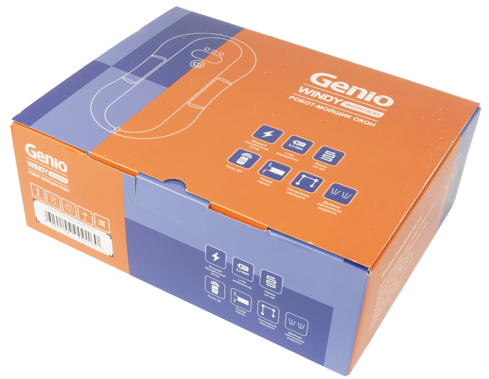 Genio Windy W220 Duo прибыл к нам на тестирование в небольшой картонной коробке яркой оранжево-фиолетовой расцветки. На лицевой стороне упаковки мы видим векторное изображение модели, ее полное название, логотип компании и пиктограммы с подписями обозначающие ключевые характеристики устройства. Описание комплекта прибора и информация о производителе размещены на боковых гранях коробки.