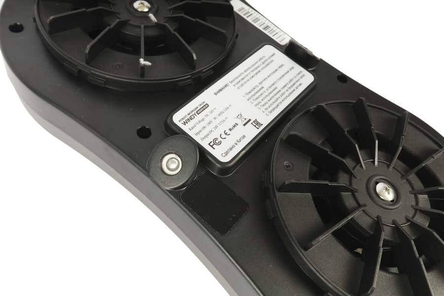 На нижней панели, между держателями для колес размещена наклейка с технической информацией. По бокам от нее мы видим два скошенных выступа — это отверстия для распыления жидкости.