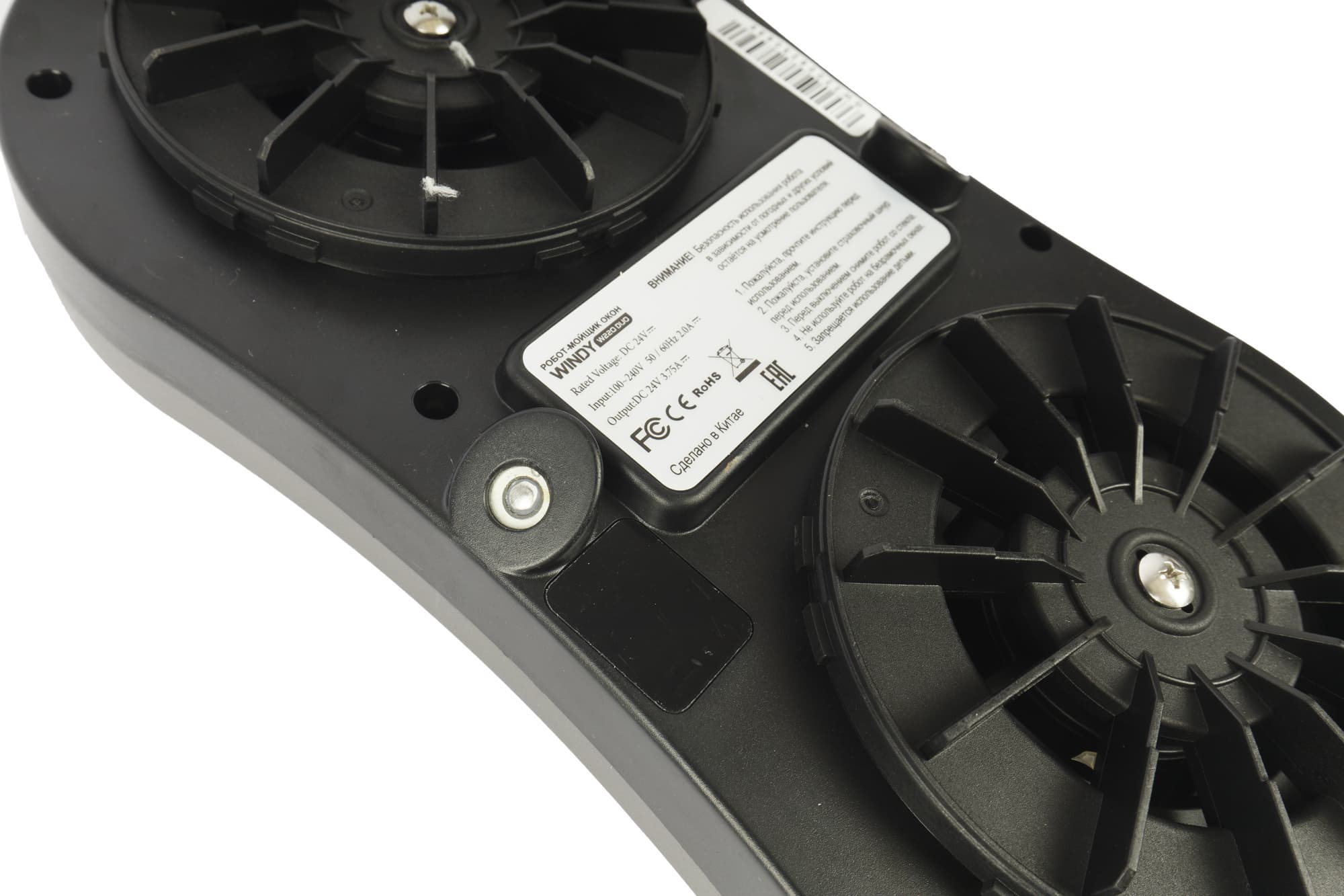 Рядом еще одна наклейка, со штрих-кодом. С другой стороны встроены светодиоды с дублирующими индикаторами, что позволяет следить за состоянием устройства с обеих сторон стекла. Вверху, над держателем колеса прикрытое силиконовой заглушкой, располагается отверстие для залива воды или моющего средства.