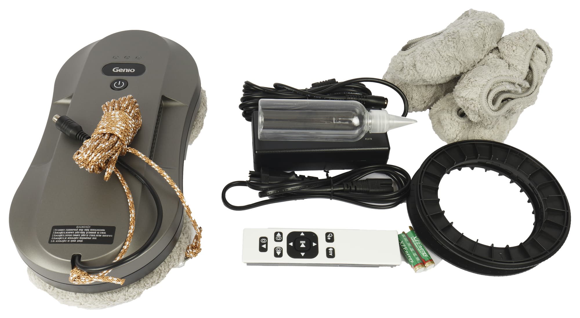 Прибор оснащен тремя режимами работы, двумя распылителями и емким аккумулятором, позволяющим удерживаться на стекле около часа при внезапном отключении электропитания. Базовая комплектация включает четыре съемных колеса и 10 салфеток из мягкой гигроскопичной микрофибры.