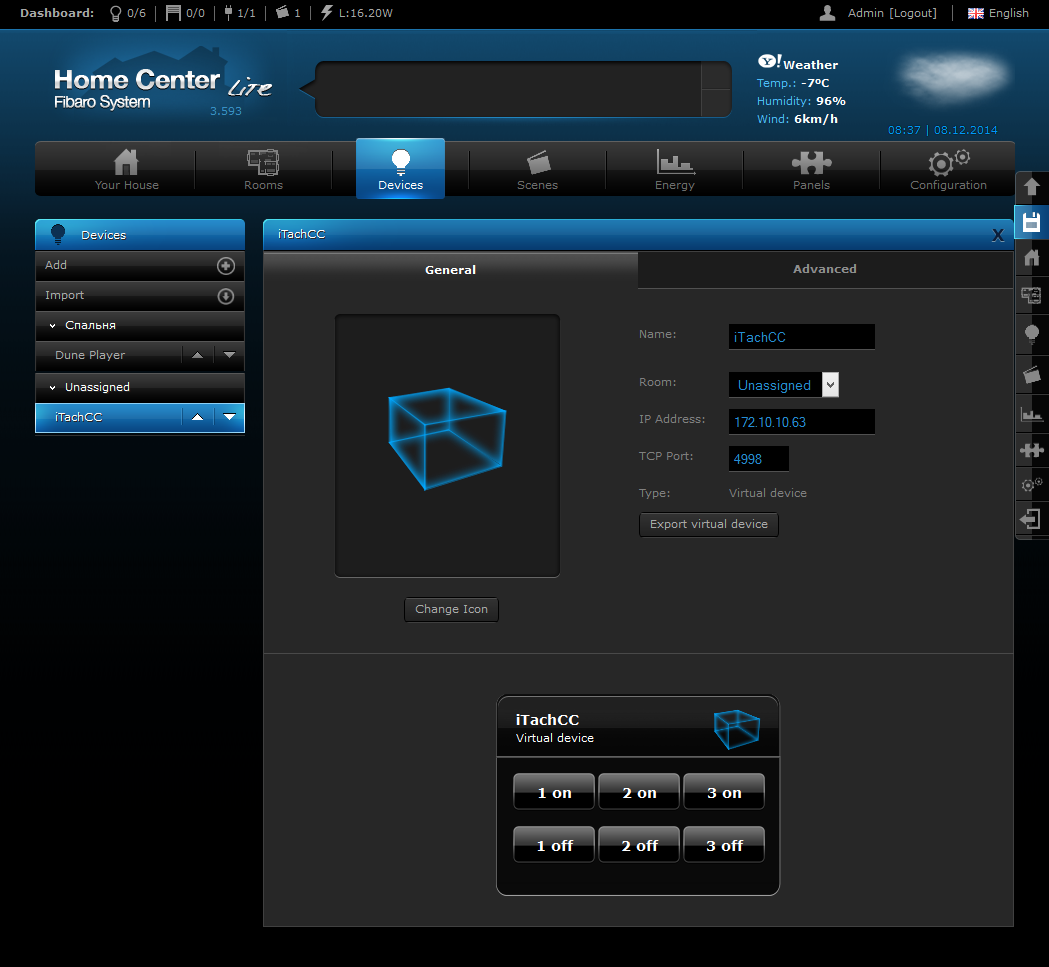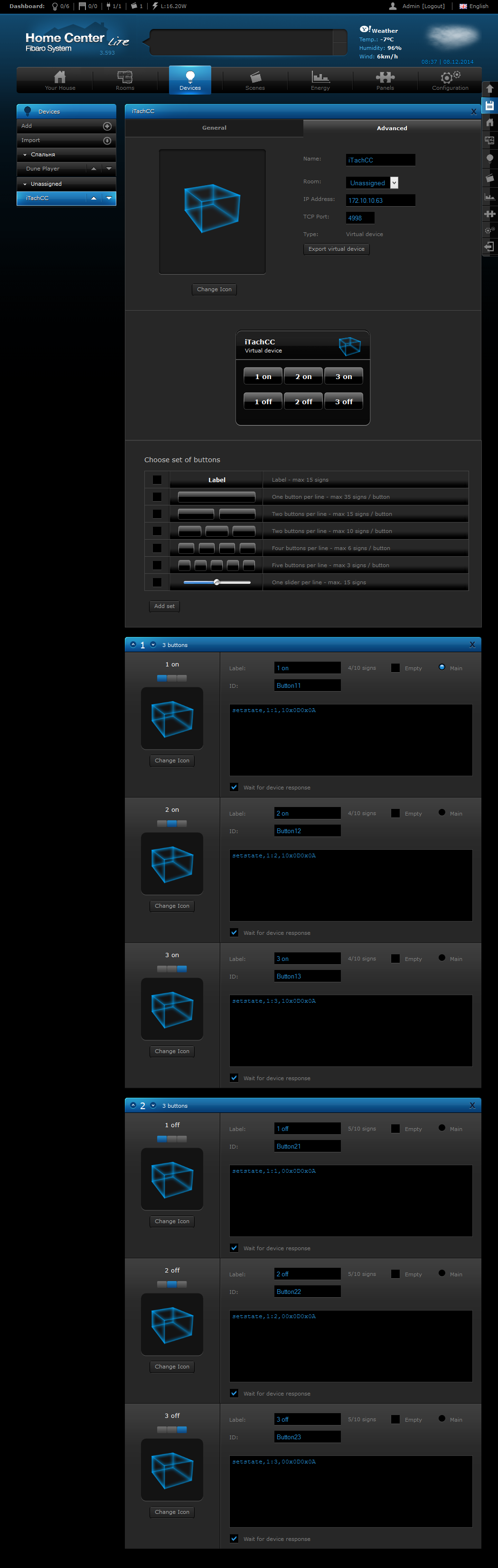 Второй сценарий мы реализовали с контроллером Fibaro Home Center Lite. Благодаря поддержке виртуальных устройств, работающих по IP-сети, мы смогли создать пользовательские элементы управления (кнопки) и привязать к ним определенные команды для отправки на адаптеры Global Cache. За исключением подбора требуемых ИК-кодов и тонкостей форматирования отправляемых команд, никаких сложностей в данном сценарии мы не встретили. Заметим, что в этой системе автоматизации не предусмотрено получение обратной связи от виртуальных устройств и контроль их состояния.