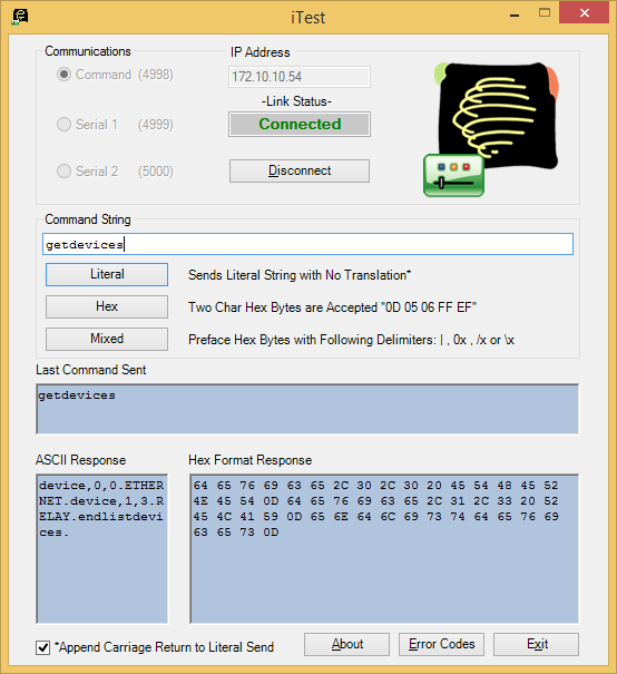 Для первоначальной проверки работоспособности адаптеров пригодится утилита iTest. Она позволяет отправлять команды на адаптеры и отображать ответное сообщение. Мы использовали ее для того, чтобы убедиться в правильной настройке всех используемых в тесте устройств. Особенно она полезна для тестирования ИК-команд управления, поскольку правильно считать код пульта ДУ получается не всегда с первого раза и перед программированием команд и скриптов нужно быть уверенным, что все работает, как ожидалось. Ну а дальнейшее уже было делом техники.