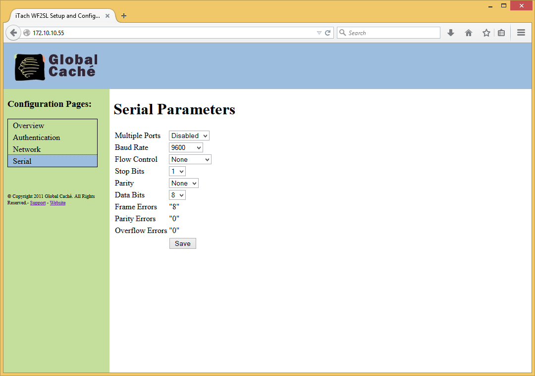 Веб-интерфейс адаптеров предоставляет только базовые настройки устройств. Отметим, что доступ к нему можно защитить паролем. Для серии CC в нем есть только сетевые настройки. В моделях для последовательного порта здесь выбираются его параметры — скорость, четность, управление потоком и другие. В случае проблем может помочь отображаемая статистика ошибок приема и передачи данных.