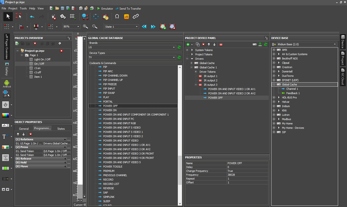 В качестве примера мы создали интерфейс с двумя переключателями для трех каналов IP2CC и несколькими кнопками для управления техникой через ИК и последовательный порт. Заметим, что здесь можно использовать и обратную связь, что может быть полезно, например, для контроля состояния выходов реле и изменения внешнего вида кнопок. Обратите внимание, что конкретные ИК-команды доступны во встроенной базе данных и достаточно использовать простое перетаскивание мышкой для их использования. И конечно можно назначить одной кнопке интерфейса не просто одну команду, а целый скрипт, например, для включения домашнего кинотеатра для режима просмотра видео с медиаплеера.