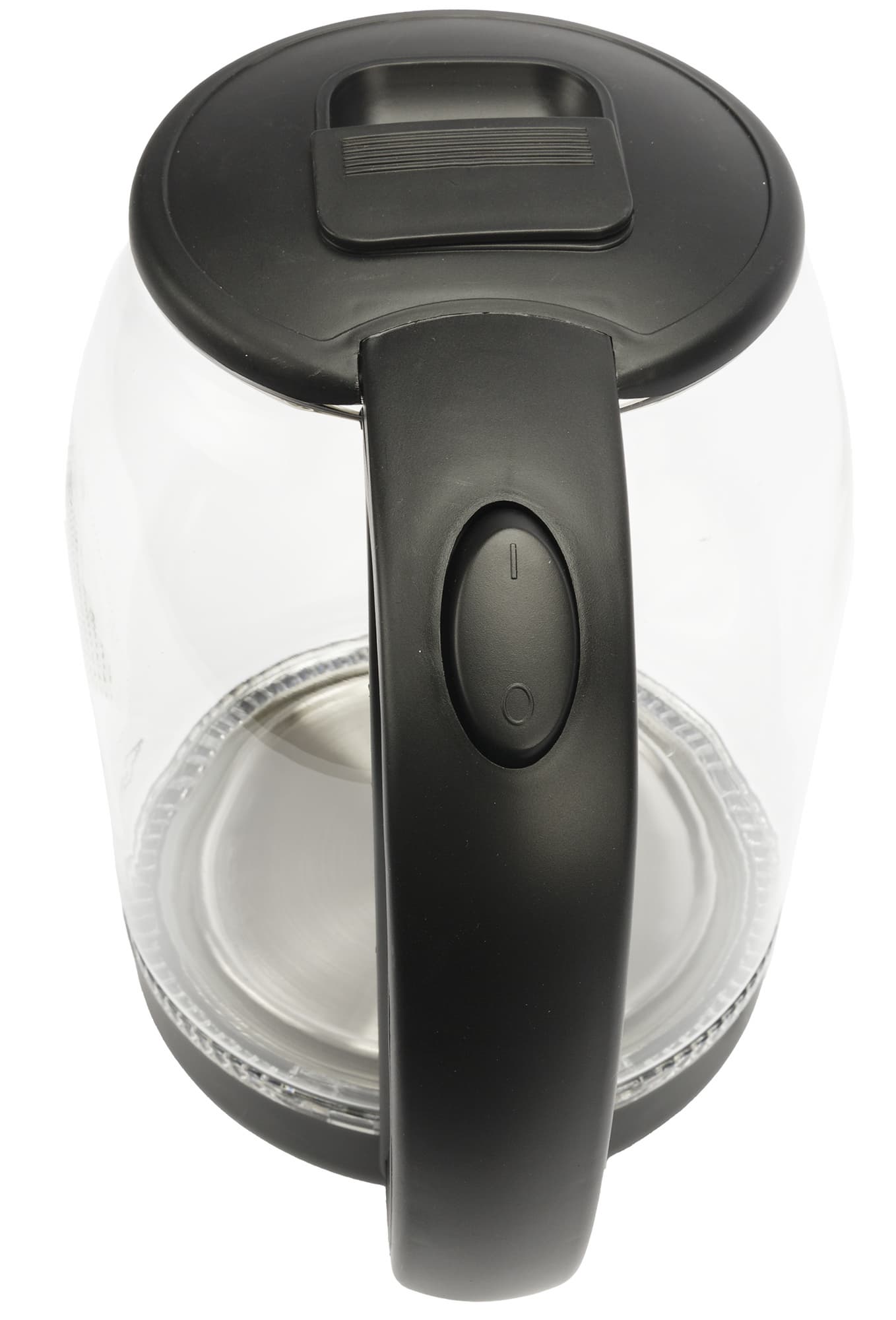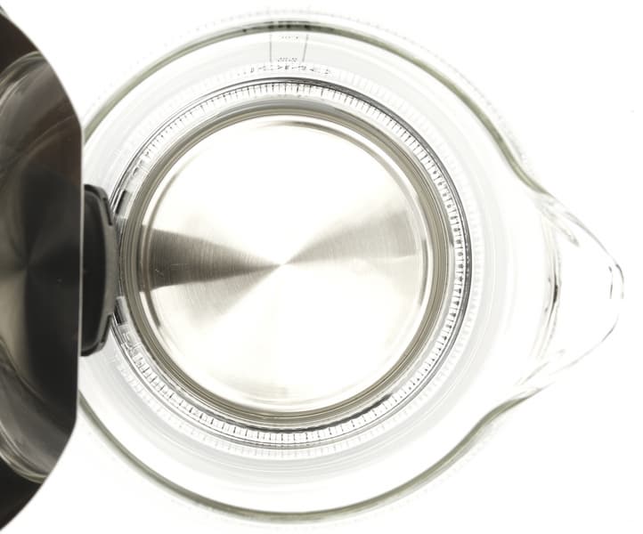 Колба чайника изготовлена из закаленного стекла. На лицевой стороне нанесена градуировка с рисками 0,5, 1,0 и 1,8 л. Отметки не совсем точны, мы обнаружили, что риски 0,5 л и 1,0 л на миллиметр выше, чем должны быть, а до отметки 1,8 на самом деле помещается только 1,6 л.