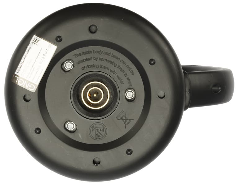 На дне чайника находится контактная группа из двух концентрических колец из желтого металла и центрального штыря. Рядом есть наклейка с технической характеристикой.