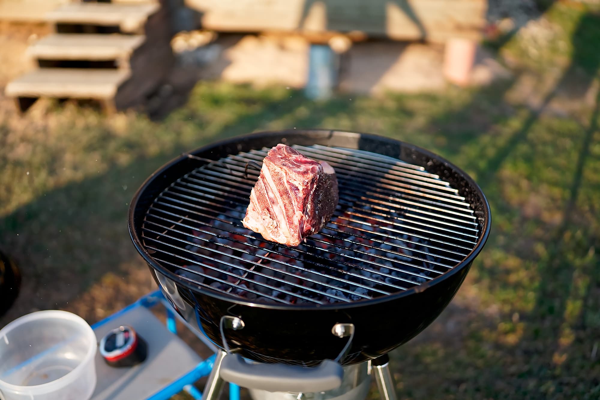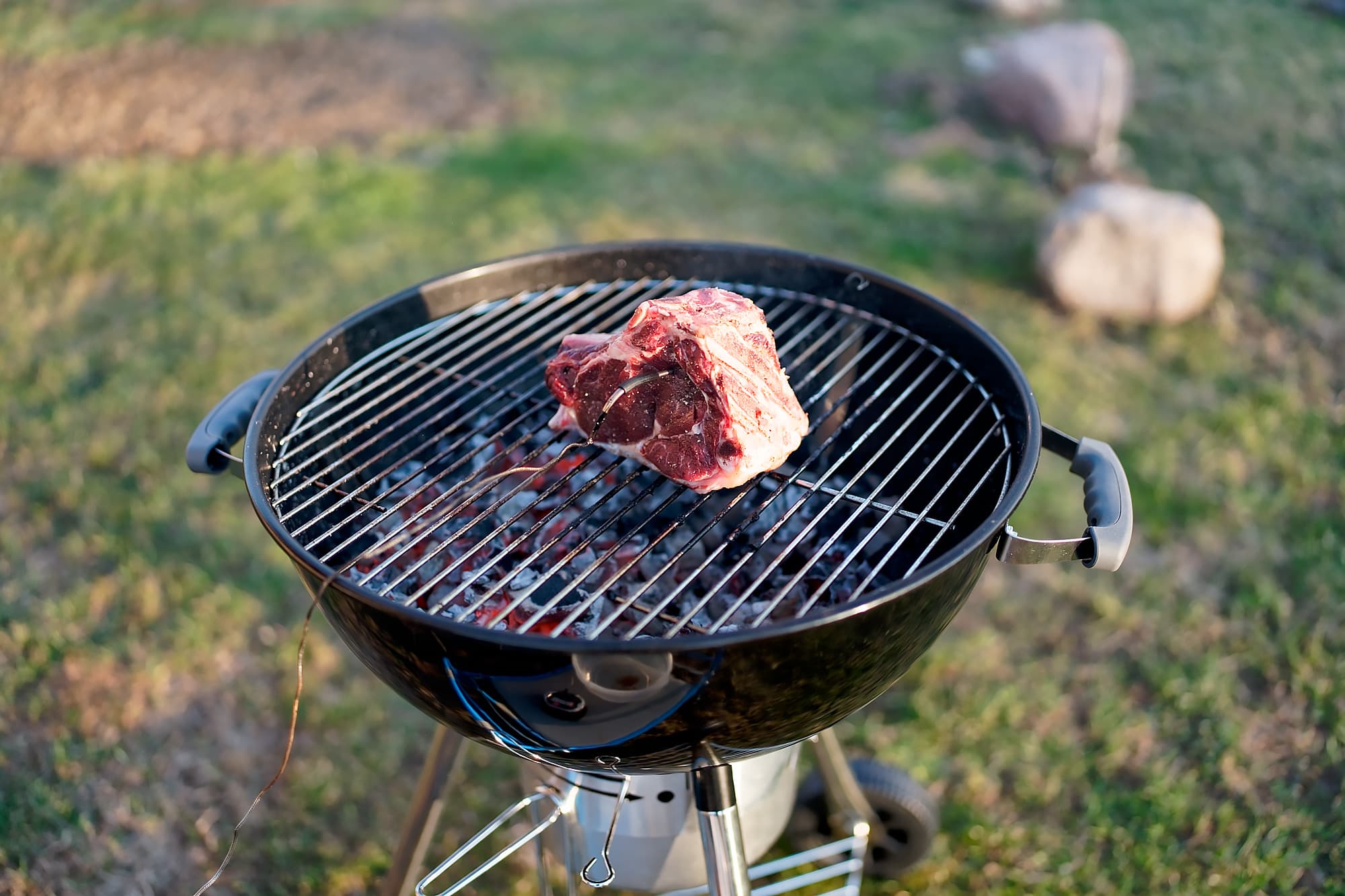 Затем воткнули в центр щуп от термометра (наш достался нам от компании Weber, и мы на него не нарадуемся), установили показатель «Ростбиф на кости. Медиум» и поместили в гриль под крышку.