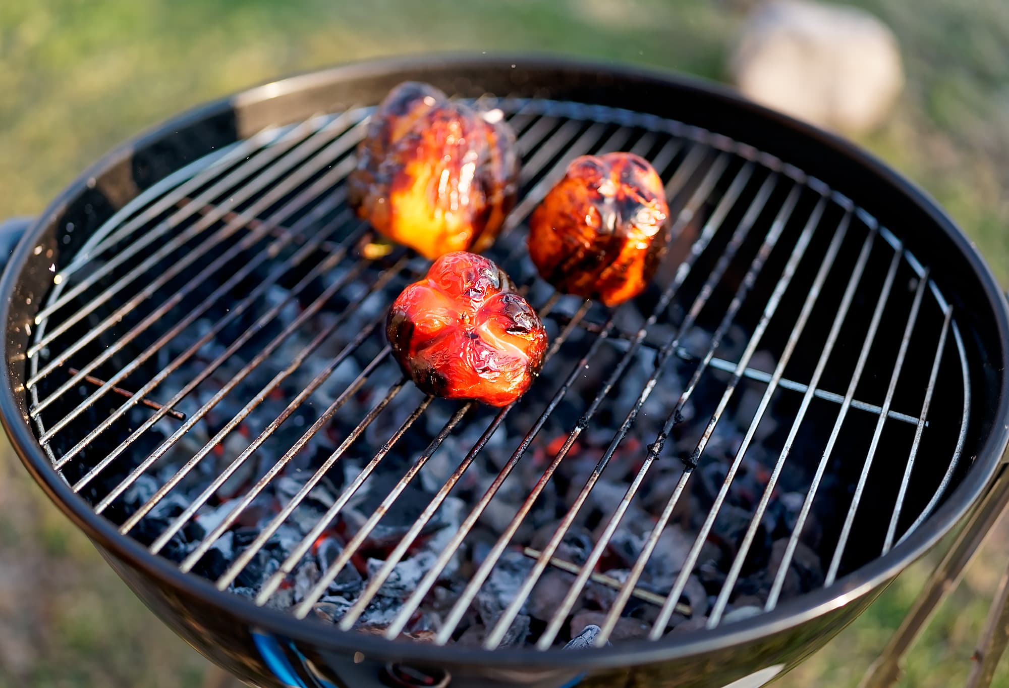 Решетка нашего GoGarden Premium 56 велика. Стейки из прошлого теста весили по полкило каждый — и все равно места на решетке осталось достаточно. Так что мы запекли три огромных перца: стейки уже сняли, а перцы обугливали до почернения кожицы.