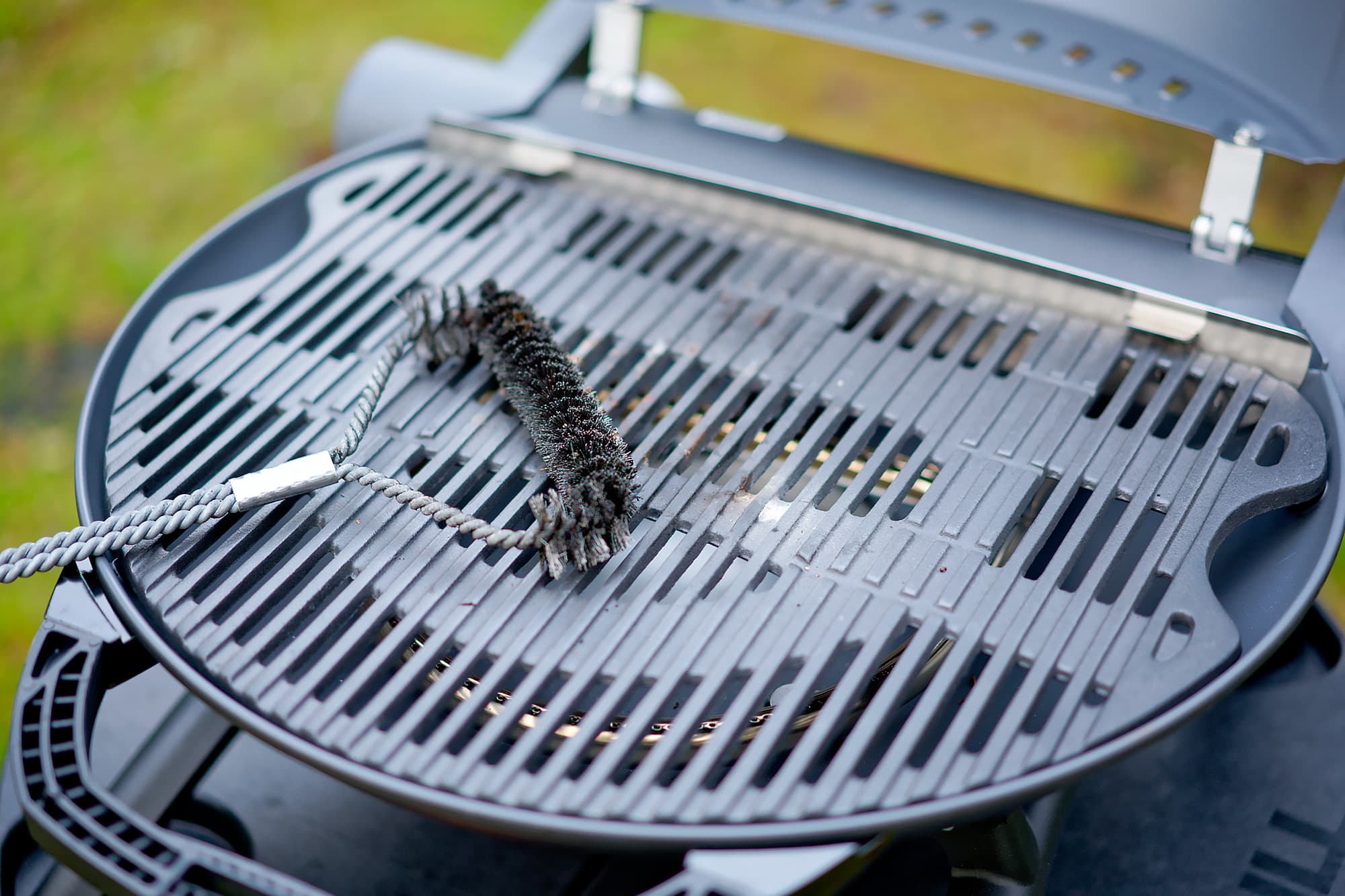Крупные куски пищи с решетки удаляются пиролитическим способом: просто оставьте пустую решетку под крышкой в максимально «раскочегаренном» гриле минут на 10-15. Для более мелких и самых стойко прилипших фракций можно использовать специальную щетку для чистки решеток, выглядит она примерно вот так.