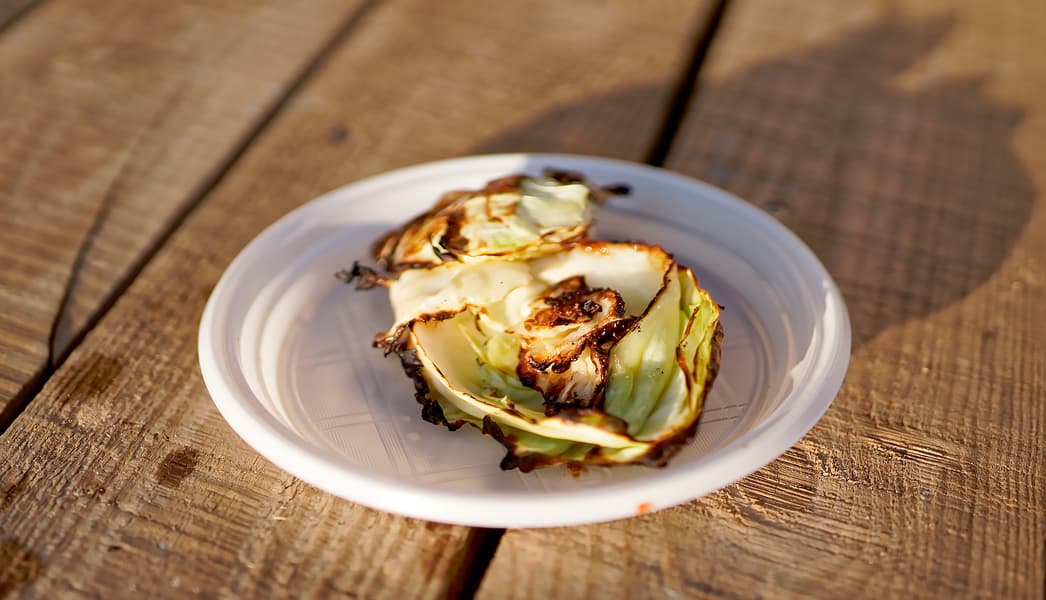 Параллельно со стейками на гриль поместили кусок молодой капусты, посолив его и смазав маслом.