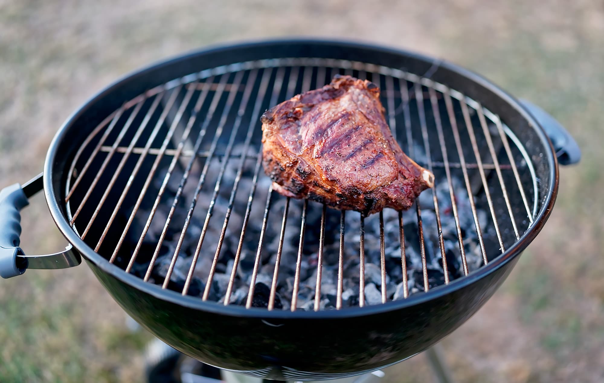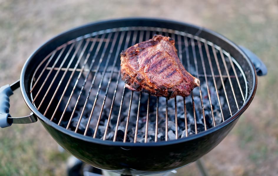 Где гриль — там и стейк. Три куска рибая поместили на раскаленный гриль. В один из них воткнули щуп от термометра для гриля, чтобы получить желаемую степень прожарки.