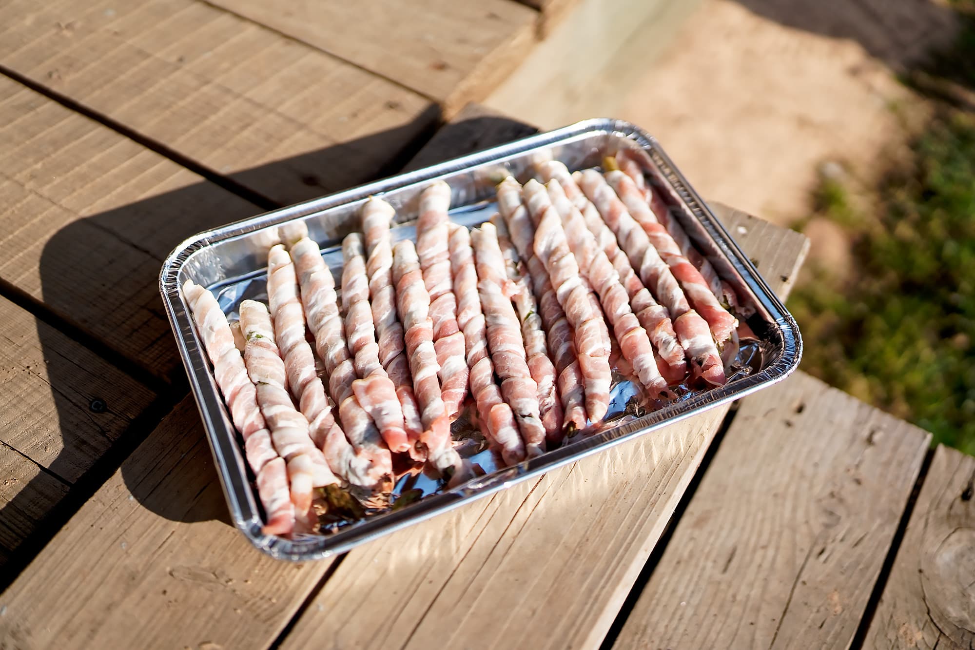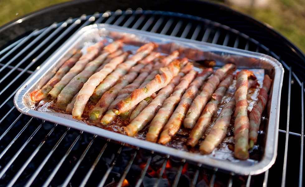 Побеги зеленой спаржи обмотали полосками бекона и поместили в фольгированный поддон для гриля.
