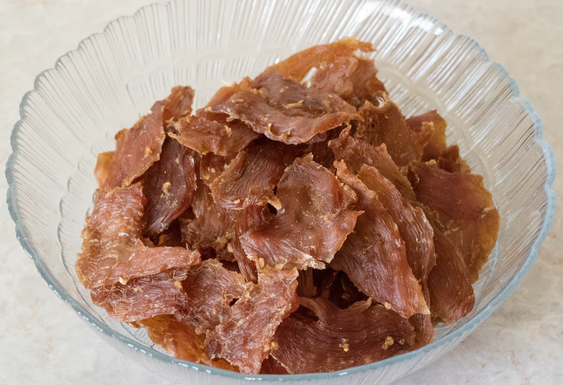 В процессе сушки несколько раз меняли поддоны местами. Сушка на 68 °C заняла 8 часов, затем уменьшили температуру до 65 °C. Всего обработка продолжалась в течение 14 часов. Ломтики получились прозрачные, жесткие и ломкие. Как показывает практика, через некоторое время, при хранении в холодильнике, кусочки сушеной курицы становятся мягкими и гибкими на излом.