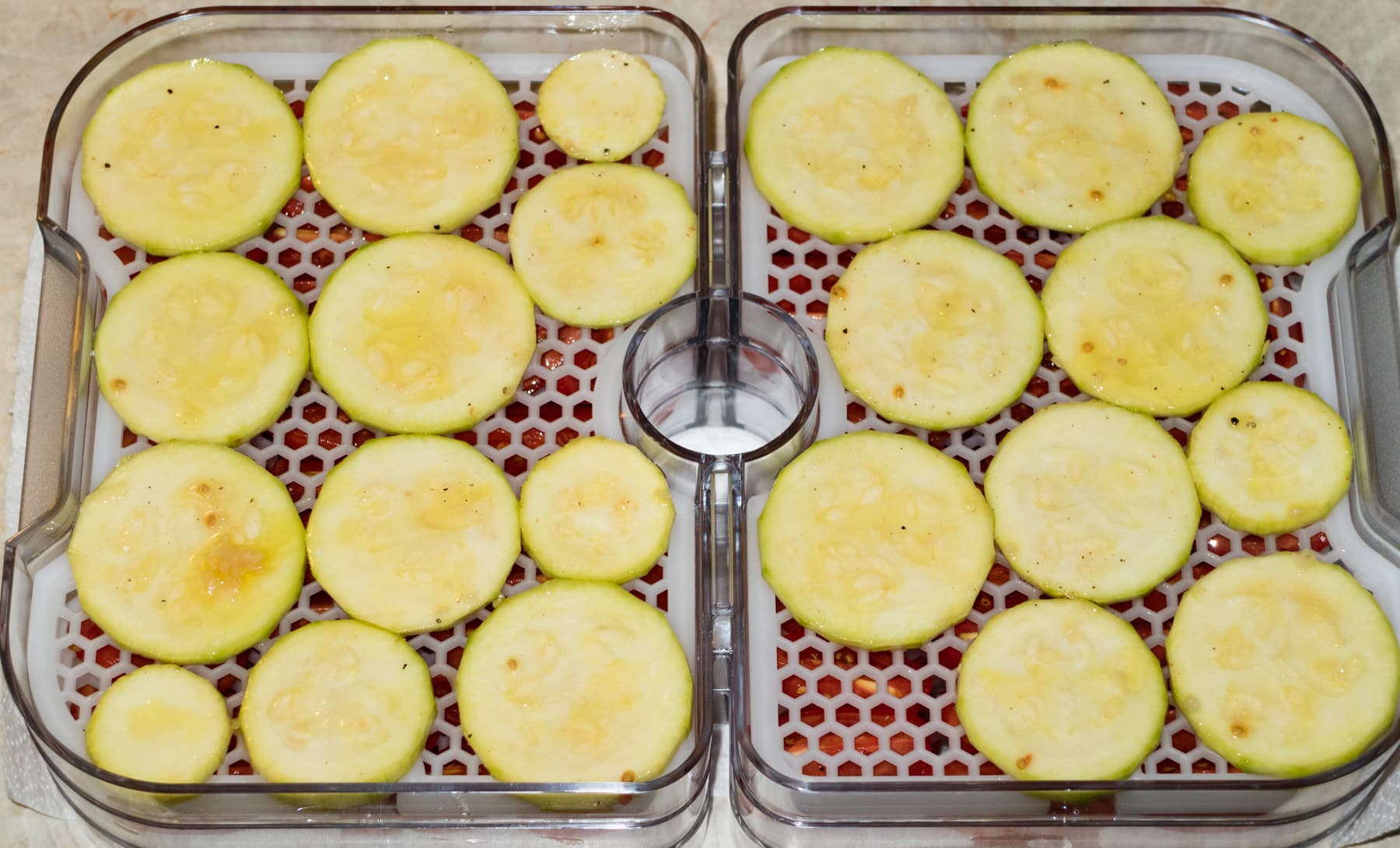 Первые 20 часов дегидрировали на 60 °C. Сначала нужной степени готовности достигли яблоки. Ломтики получились сухие, мягкие и гибкие. Обработку оставшихся фруктов и помещенных в соседнюю камеру куриных грудок продолжили на температуре в 67 °C.