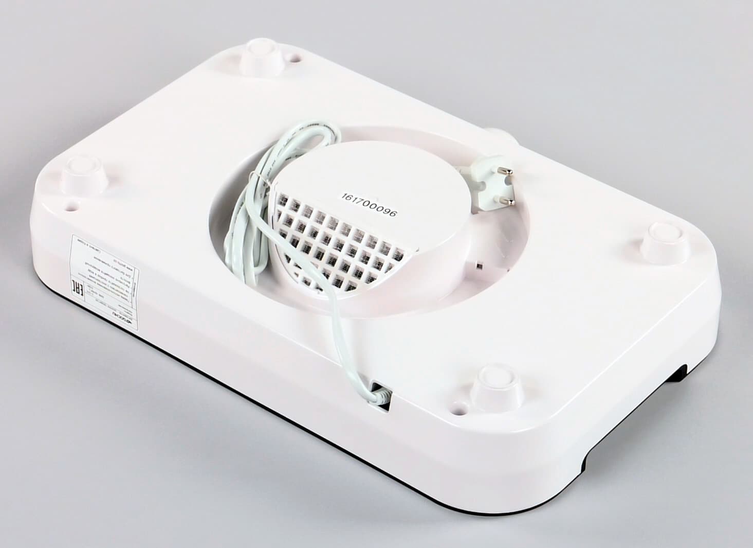 Со стороны дна можно увидеть четыре ножки с прорезиненными накладками, служащими для лучшего сцепления с поверхностью стола и защиты поверхности от царапин и следов прибора. Высота ножек чуть менее 2 см, что нам представляется вполне достаточным для циркуляции воздуха и охлаждения корпуса во время работы.