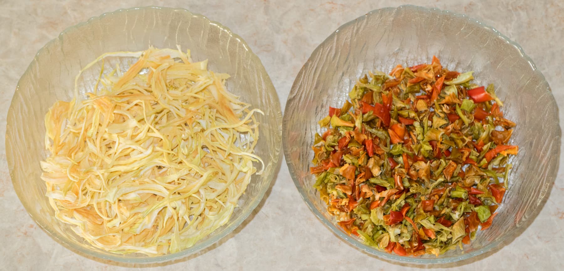 Продукты не перемешивали — сделать это и не просыпать, в частности, болгарский перец сквозь отверстия поддонов, представлялось невозможным. Потому мы просто усушили продукты до состояния ломкости и полной потери влаги.