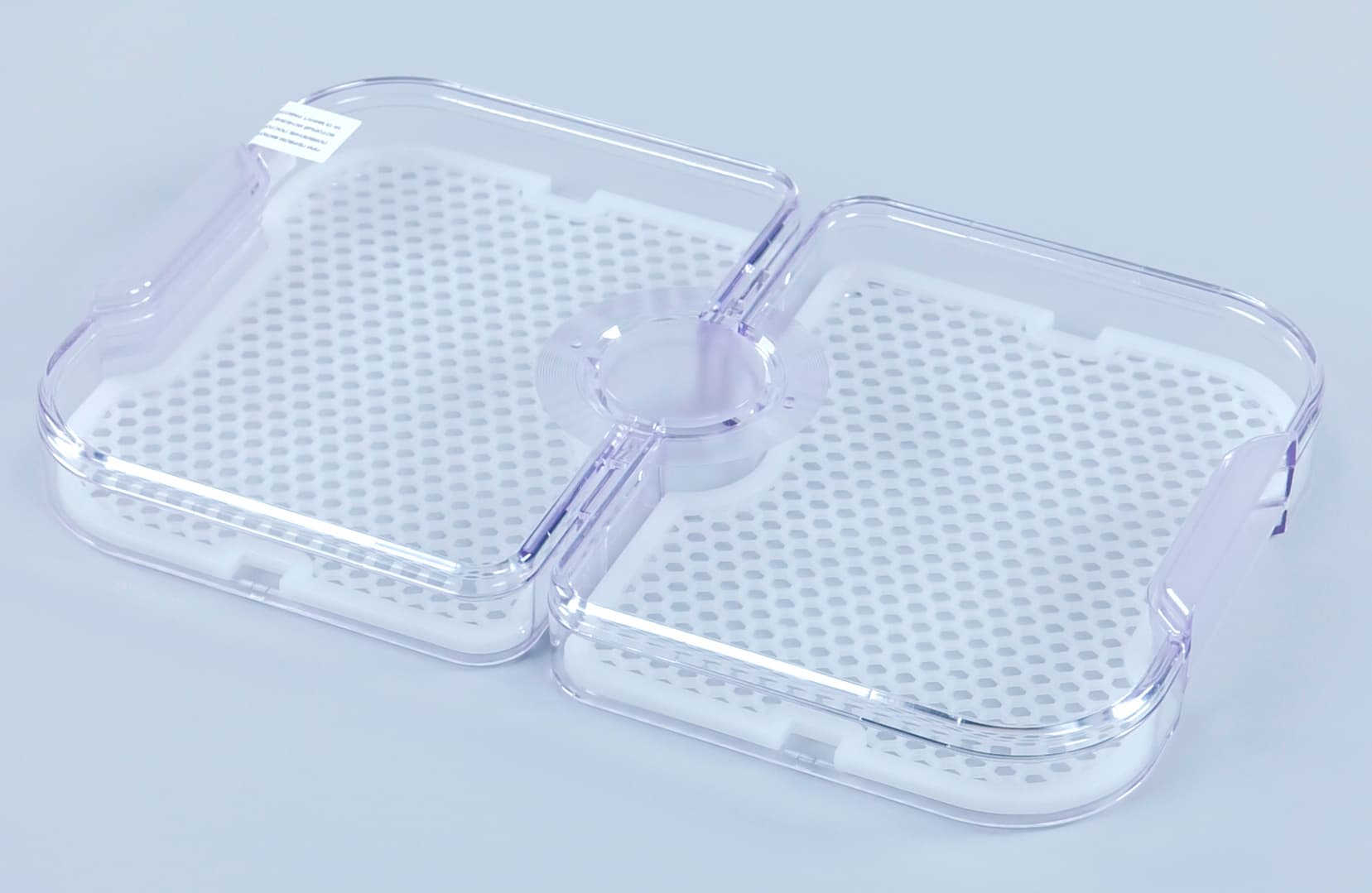 По причине сложной геометрической формы поддонов, их вместимость мы можем измерить только приблизительно. Площадь одного поддона — около 0,039 м², площадь всех 20 сетчатых поддонов составляет чуть менее 0,8 м². При компактном размере самого устройства это довольно хороший, на наш взгляд, показатель.