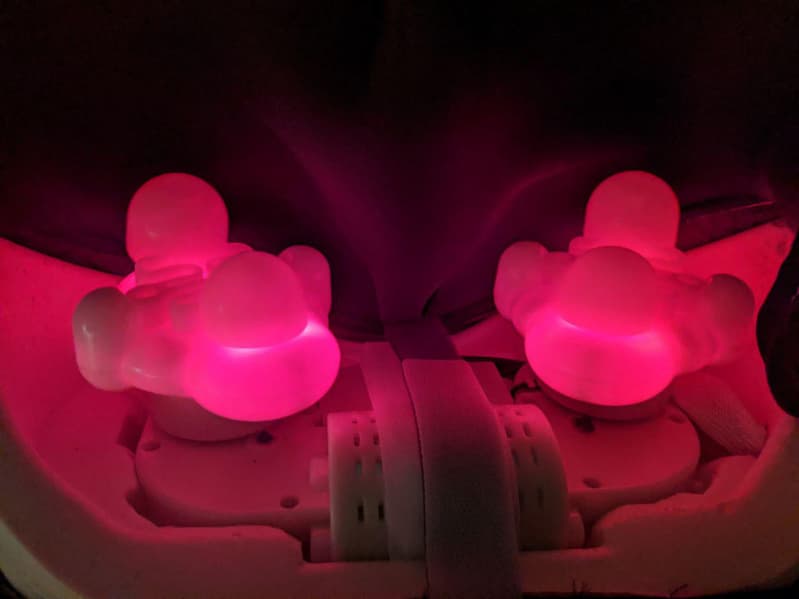 Внутри массажных головок смонтированы инфракрасные излучатели. При включении функции прогрева полупрозрачный пластик головок светится темно-красным светом, заметным даже через сетчатую ткань подголовника.