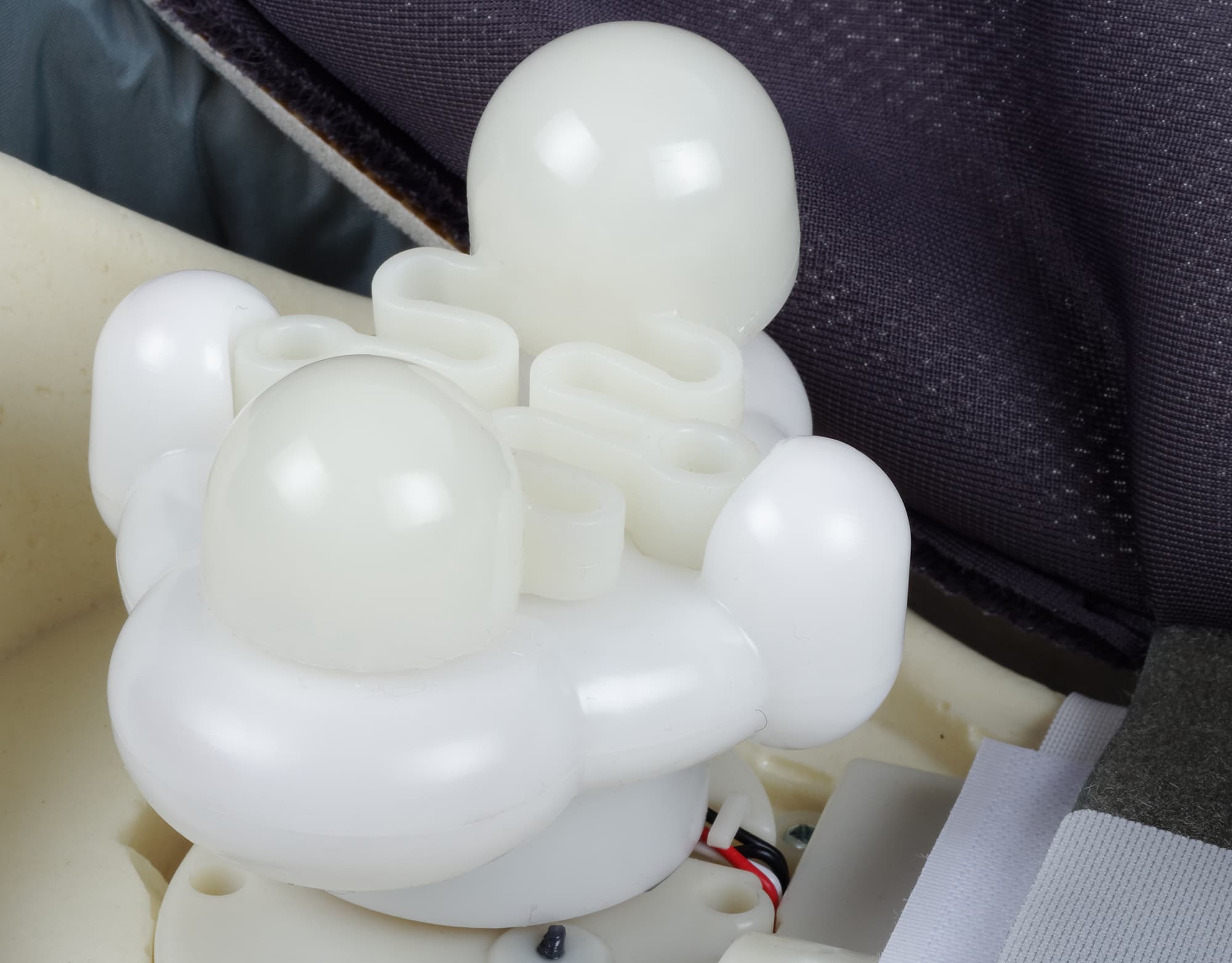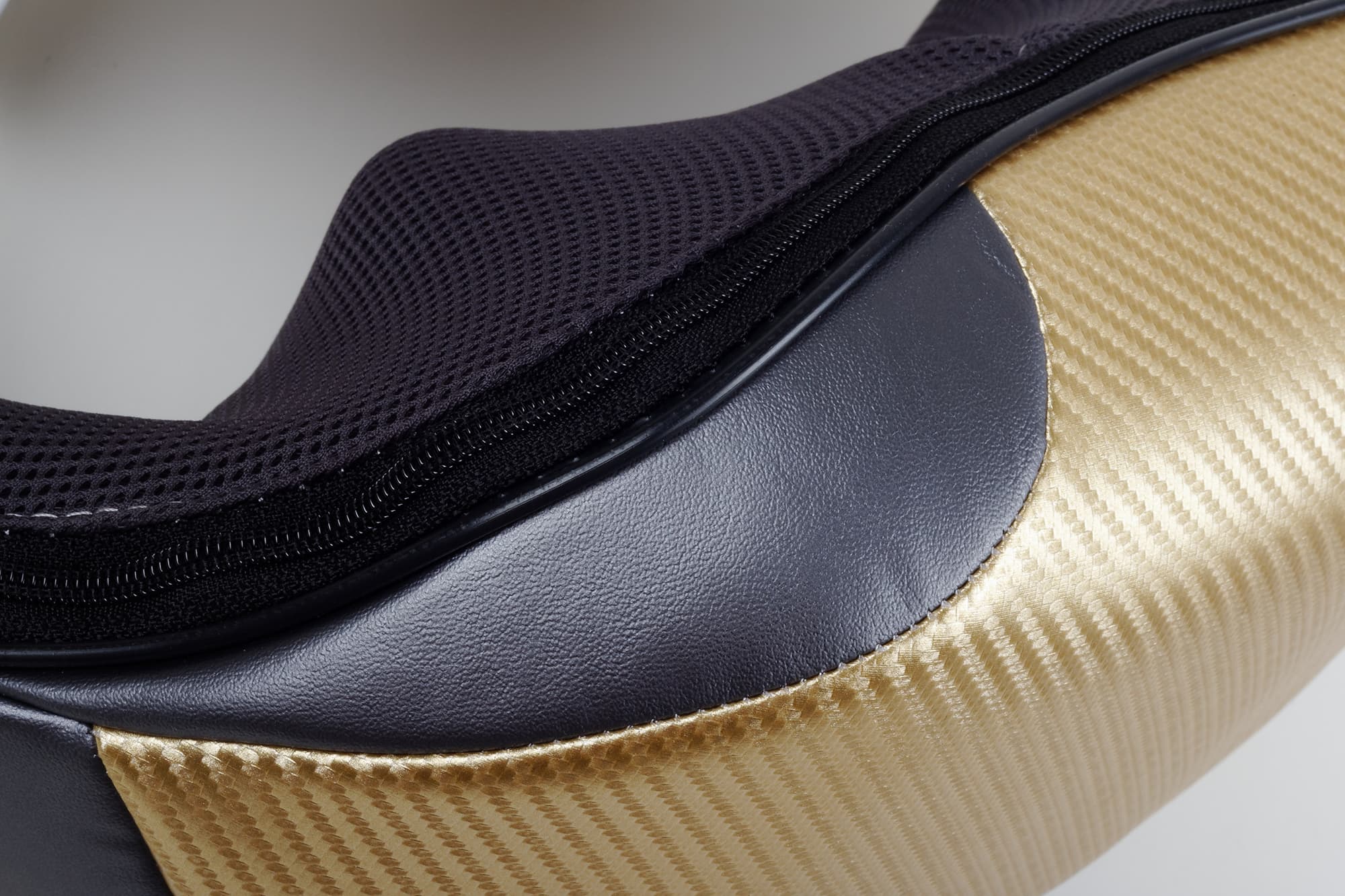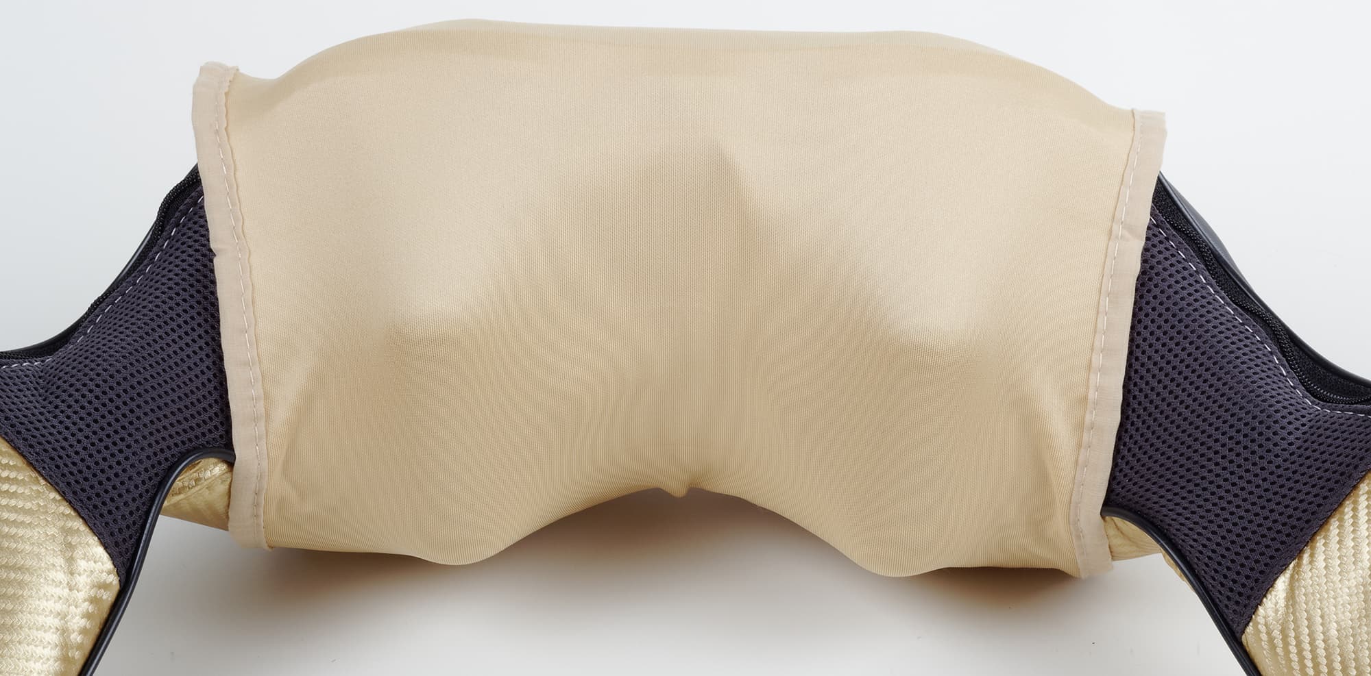 Основная часть массажера затянута темно-серой мембранной тканью, для дополнительной гигиеничности на нее надо надеть чехол из синтетики телесного цвета, довольно приятной на ощупь. Петли сделаны из мягкого полиуретана, сверху гладкие, золотистые, а с изнанки и частично снаружи — серебристо-графитовые.